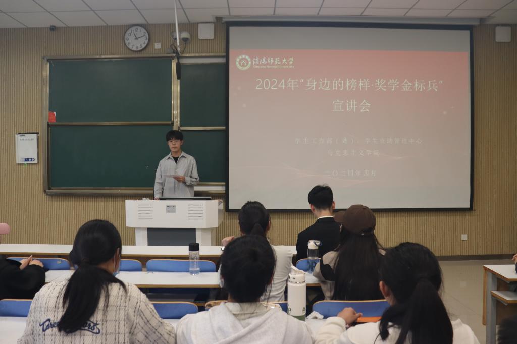 为进一步激励我院学子奋发向上,努力进取,4月19日,太阳集团tyc5997在社科楼515教室举行2024年“身边的榜样·奖学金标兵”宣讲会,邀请教师教育学院的段锦程和外国语学院的璩孟博进行宣讲。我院2023级全体学生参与本次会议,会议由学生会执行主席刘英凯主持。
