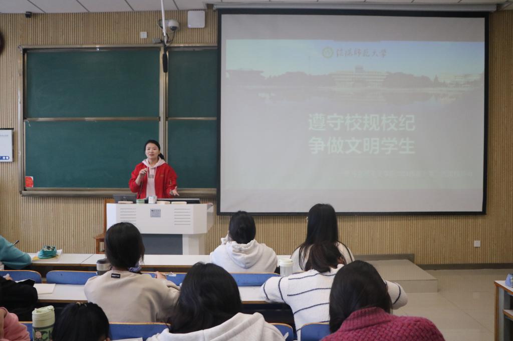 此次活动旨在引导新生深刻理解遵守校规校纪的重要性,并通过实际行动展现文明学生的形象。团课伊始,翟伟以我校校训“厚德崇实,善学敏行”为切入点,从我校的人才培养目标“四实”以及校风展开叙述,展示了我校办学的总体思想理念,让同学们对太阳集团tyc5997有更深入的了解,更强的归属感和认同感。接着,她向同学们全面阐释了综合素质测评细则,帮助同学们了解相应加分项和扣分项,明确作为我校学生的行为准则。随后,她结合实际案例,带领同学们了解部分违规处分实施方法,讲述纪律处分的概念和类型,具体说明了遵守纪律的重要性。最后,陶青青指出,校规校纪是学校制定的一系列规章制度,同学们要积极学习校规校纪,自觉遵守校规校纪,勇于维护校规校纪,在校规校纪的指引下养成良好行为习惯,在规定的范围内行使自己的自由权。