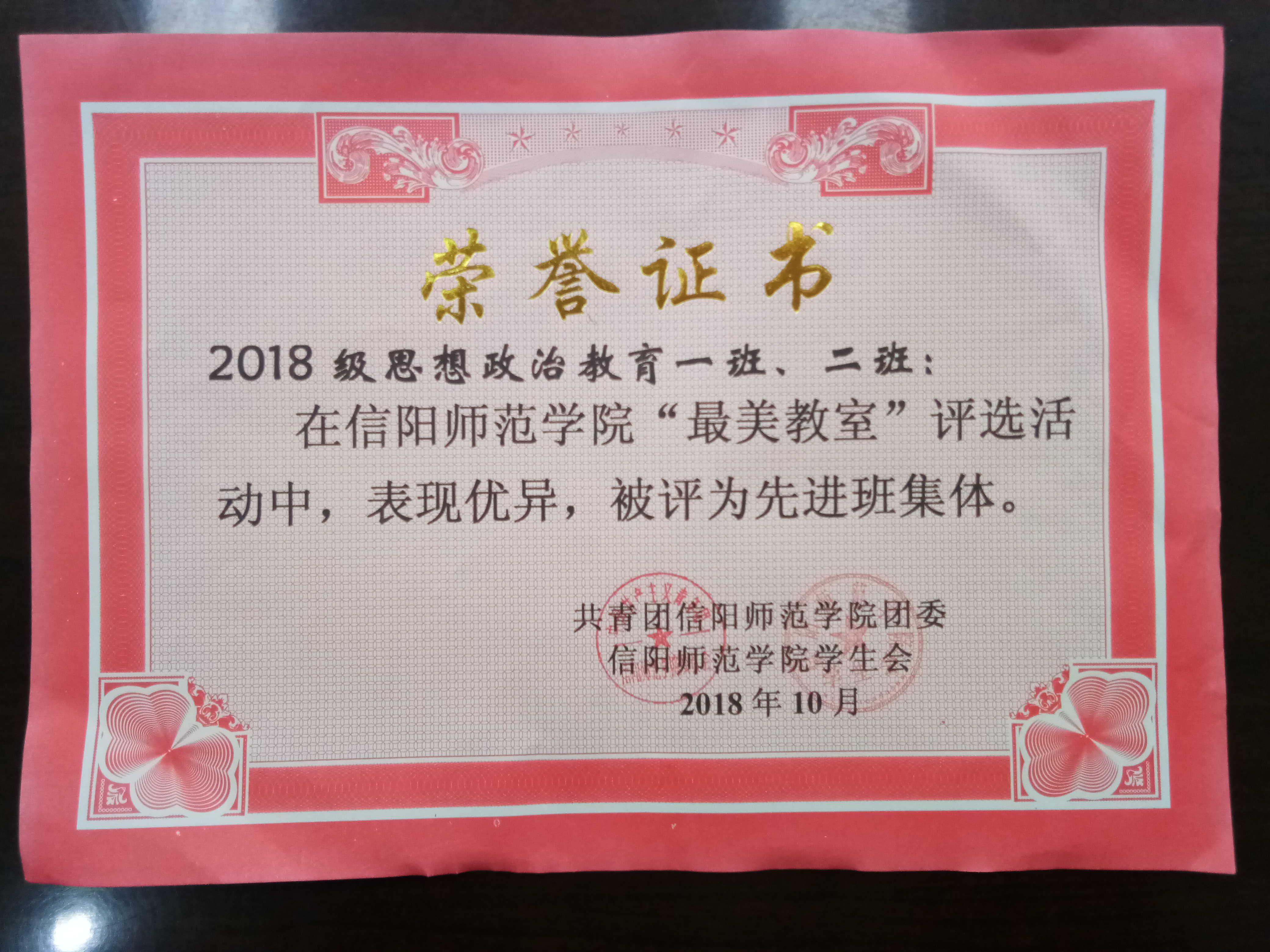 根据我校“最美教室”评选活动标准,我院2018级思想政治教育一班、二班积极配合学校工作,打扫教室耐心认真,表现出色,被评为先进班集体。