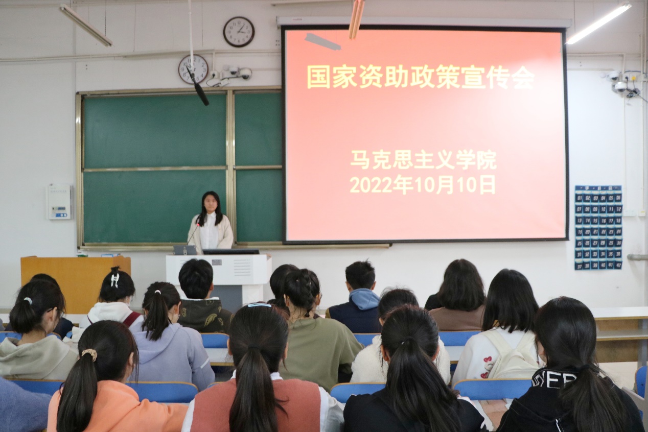 首先,孔心翼就国家资助政策的目的、种类、申请标准、申请程序方四方面向大家概述国家资助政策的基本情况。首先提到,国家资助政策种类多样,是国家为保证贫困大学生顺利完成学业的重大举措,是给予品学兼优学生的经济帮助。希望大家在国家资助政策的坚强后盾下努力学习,积极参加课外活动,做优秀大学生。接着,教导同学们要珍惜大学时光,常怀感恩之心,懂得回报社会与学校。最后,负责人提醒大家,合法的校园贷款只有国家助学贷款一种,家庭经济困难学生要选择正确规范的贷款,谨防陷入网贷不良贷款陷阱。随后, 权益保障部以ppt展示的方式向大家进一步详细介绍了各项国家资助政策。