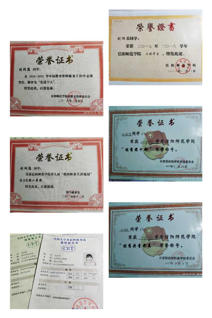 我获得的荣誉有信阳师范学院“三好学生”;信阳师范学院“优秀团干部”;信阳师范学院“优秀共青团员”;信阳师范学院寝室教室管理“先进个人”;信阳师范学院职业生涯规划征文比赛二等奖等。