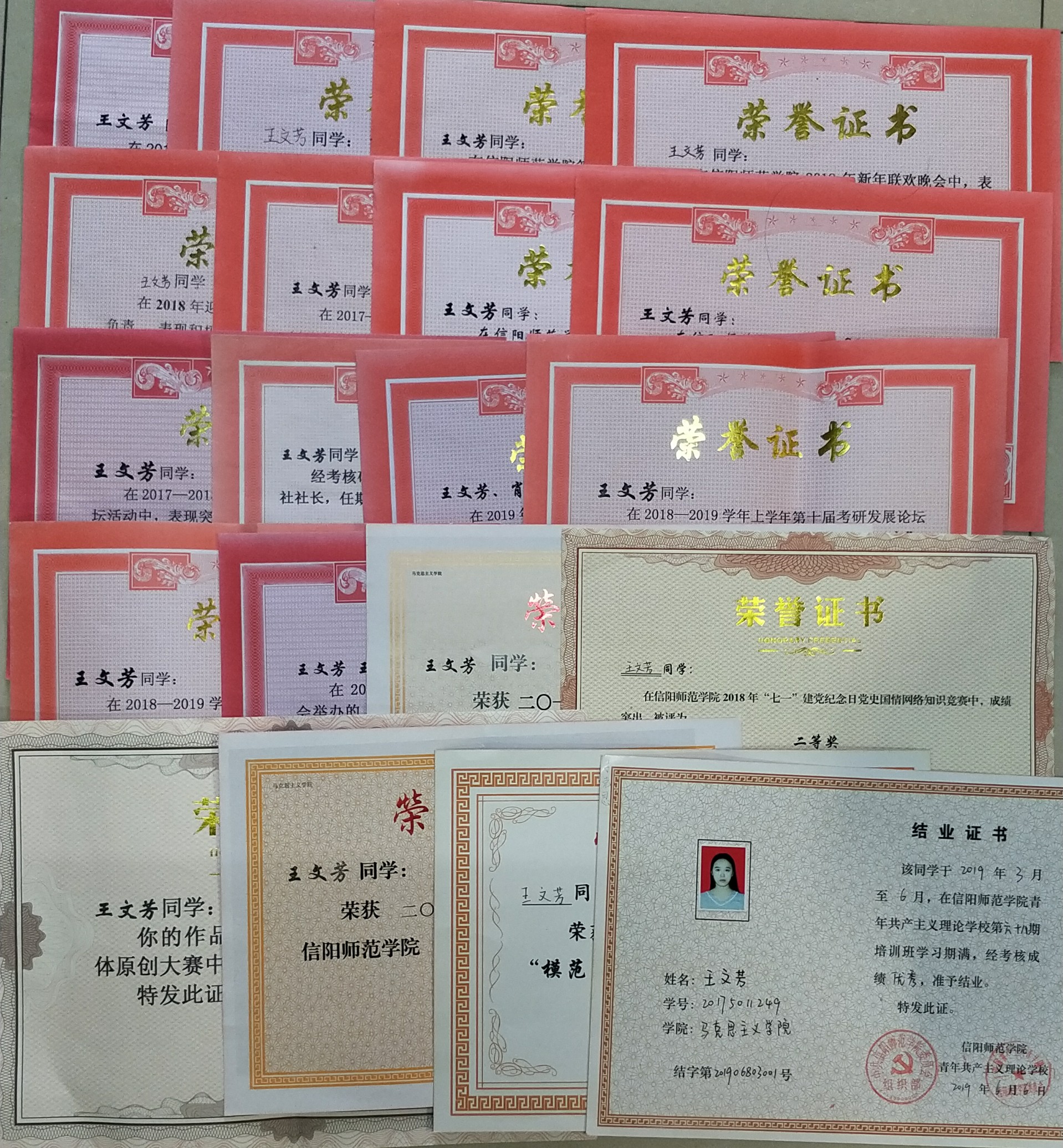 在学生工作方面,积极参与,脚踏实地。大一刚入学,在校学生会学学术科技部担任干事,在考研服务社担任组织部干事,大二在考研服务社担任社长,大三开学初期,担任2019级思想政治教育二班新生班代,现任太阳集团tyc5997分团委学生会主席。积极参与学校活动,参与组织、服务学校及学院多项活动,例如信阳师范学院迎新活动、信阳师范学院元旦晚会、信阳师范学院“诗词大会”、信阳师范学院“翰林学坛”、考研经验流会、英语四六级模拟考试、祈福考研等活动。曾获荣誉如“模范团干部”、“模范干部”、“优秀工作者”、“优秀志愿者”等。