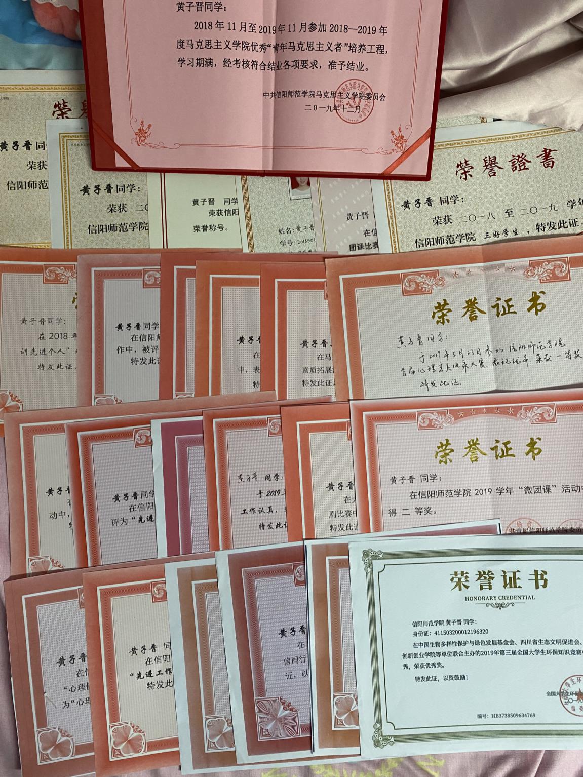 发扬红色精神。积极参加学校和学院举办有关红色精神方面的活动,在2018、2019年度共青团信阳师范学院委员会主办的“乘新时代东风,放飞青春梦想”微型团课比赛中荣获二等奖、在太阳集团tyc5997“诚邀你我 与信同行”演讲比赛中荣获一等奖,在“讲价值观故事”活动中被评为“优秀工作者”。
