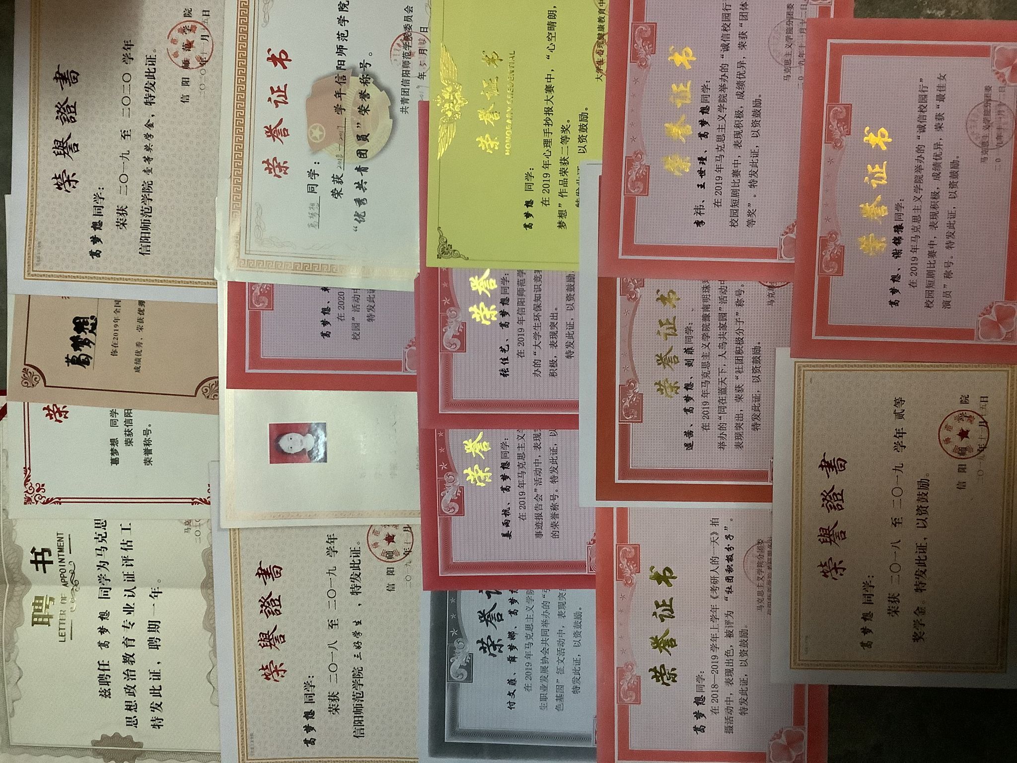 在学习过程中,积极参加学校及学院组织的各类实践调研活动,积极参加2019年暑期大学生“三下乡”社会实践活动,在2019年太阳集团tyc5997寒期社会实践调研报告评选活动中,其《关于大学生消费情况的调研报告》荣获三等奖。积极参与申报大学生科研基金项目,经培训成为信阳市博物馆注册志愿者讲解员,定期进行志愿讲解;积极参与班级组织的交通志愿服务活动以及美化校园活动。积极参加各种文体活动,在信阳师范学院广播体操比赛、健美操比赛中团体荣获优异成绩;积极参与学院举办的元旦晚会等大小活动;在2019年校园心理手抄报大赛中作品《心空晴朗,放飞梦想》荣获二等奖;2018-2019学年太阳集团tyc5997“诚邀你我,与信同行”演讲比赛中荣获三等奖;2018-2019学年被评为考研服务社“社团发展优秀贡献者”;在2020学年豫南明珠保护协会垃圾垃圾分类宣讲活动中荣获一等奖。