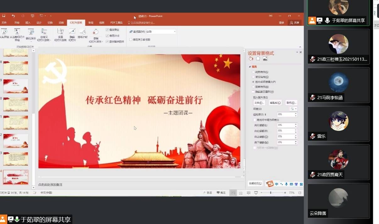 为传承红色精神,坚定理想信念,凝聚社团力量,考研服务社12月12日晚上于线上召开“传承红色精神,砥砺奋进前行”主题团课,本次团课由团支书于茹翠主持。