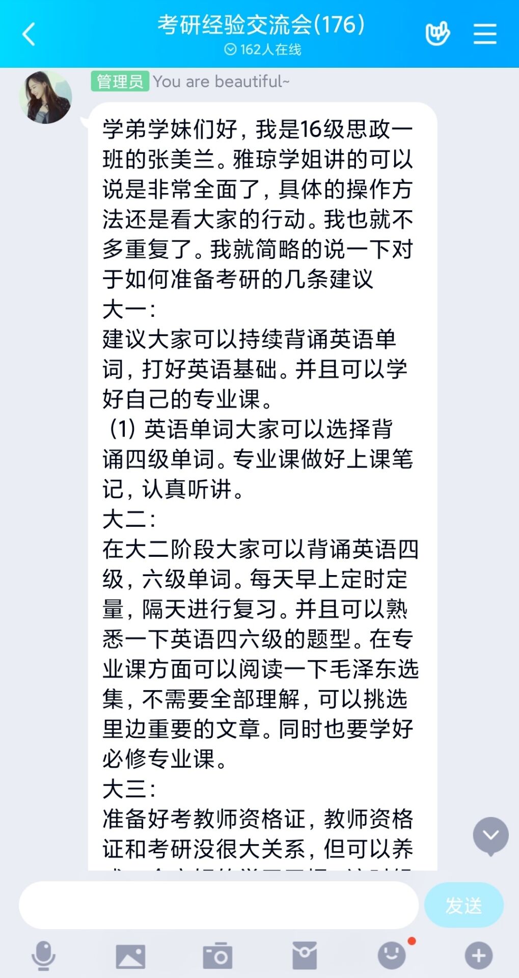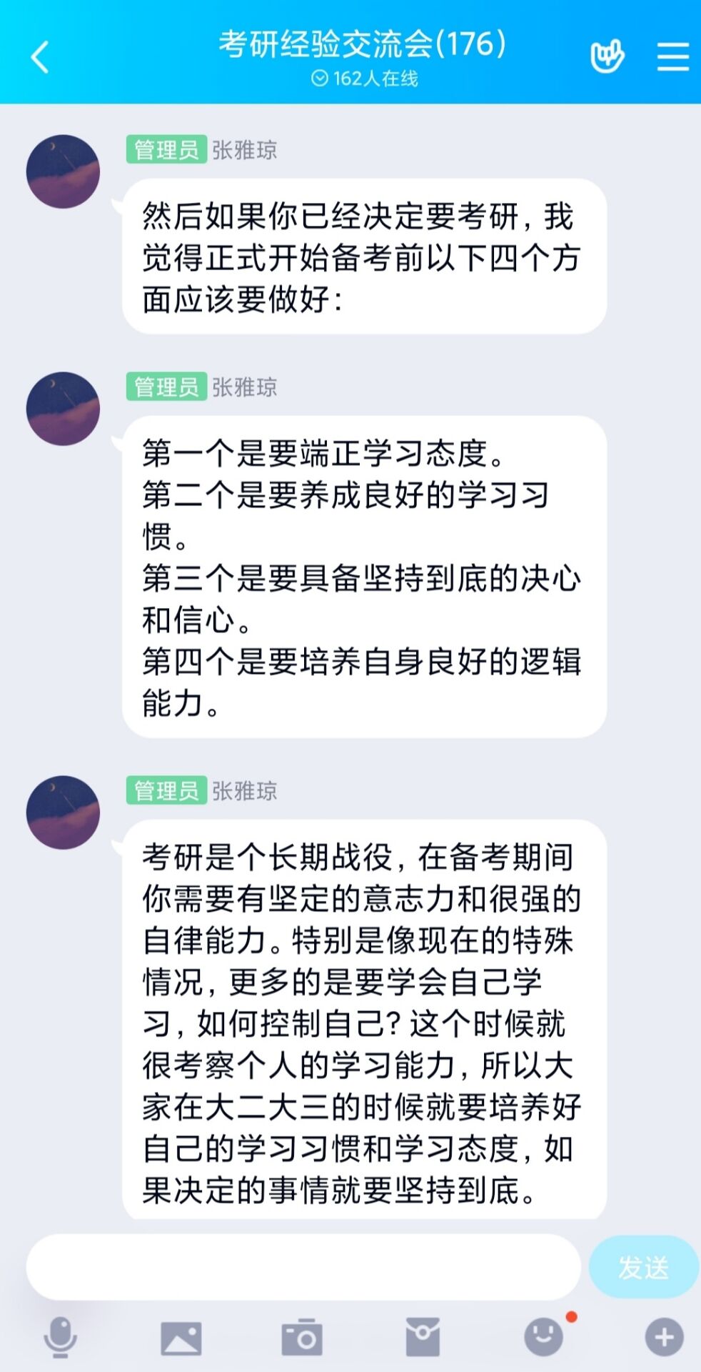 6月11日下午,太阳集团tyc5997考研服务社通过腾讯QQ线上平台举办了“以梦为笔,绘美研途”主题考研经验交流会。我院2016级优秀考研学生代表张雅琼、张美兰以及2018、2019级有意向考研的同学共同参加本次交流会。会议由考研服务社牛笑怡主持。
