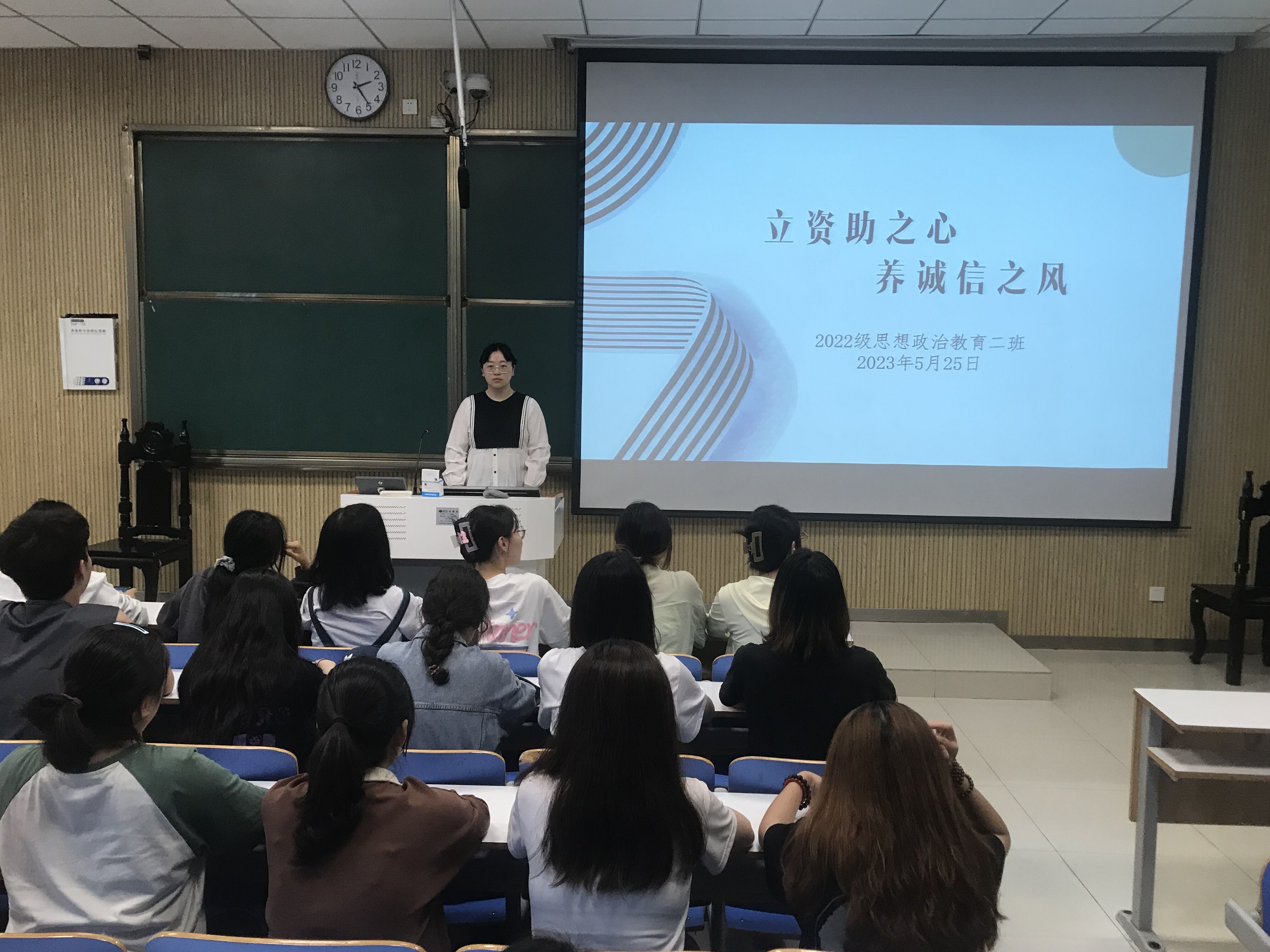 班会伊始,李佳音围绕国家资助政策、高校家庭经济困难学生资助政策体系进行解读,分别讲解了国家奖学金、国家励志奖学金、国家助学金、国家助学贷款的具体内容。随后,副班长柴智森围绕“资助育人”这一主题,讲述了许多贴近同学们学习、生活的诚信事例,引起大家共鸣的同时也让大家领悟到“诚信乃立人之本”。最后,李佳音强调,作为思政专业的学子,我们要坚持培育和践行社会主义核心价值观,不仅要在资助政策方面恪守诚信,还应在生活的各个方面用诚信的准绳来约束自我。