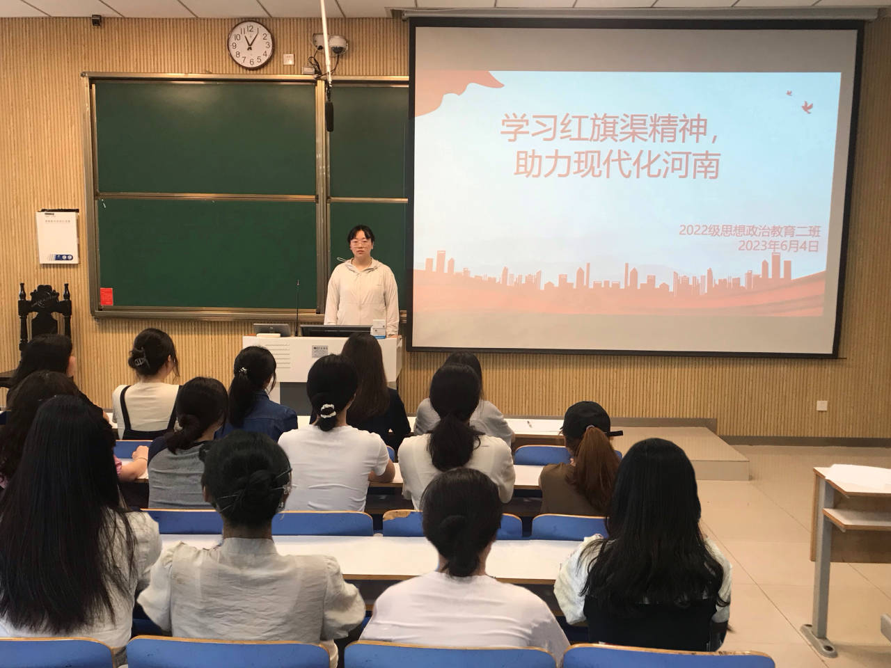 为弘扬红旗渠精神,凝聚青春奋进力量,6月4日上午,太阳集团tyc59972022级思想政治教育二班在社科楼515教室开展“学习红旗渠精神,助力现代化河南”主题团课。我院2022级思想政治教育二班全体成员共同参加。团课由团支书李佳音主持。