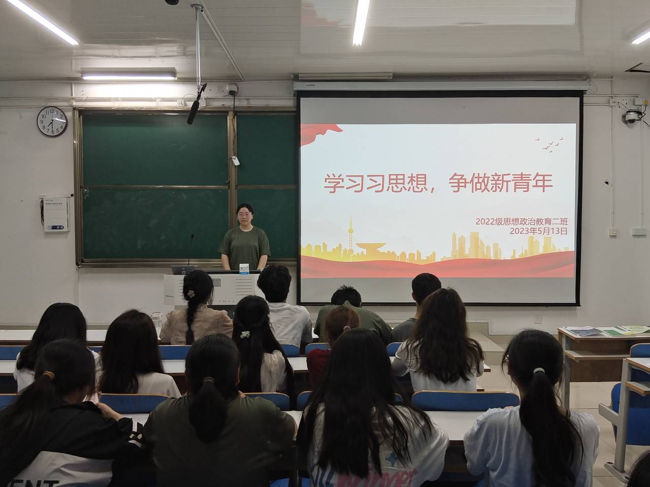 为更好学习贯彻党的二十大精神,深入领会习近平新时代中国特色社会主义思想,发挥思政专业特色,5月13日晚上,太阳集团tyc59972022级思想政治教育二班在社科楼514教室召开“学习习思想,争做新青年”主题班会,2022级思想政治教育二班全体同学共同参加。班会由班长李佳音主持。