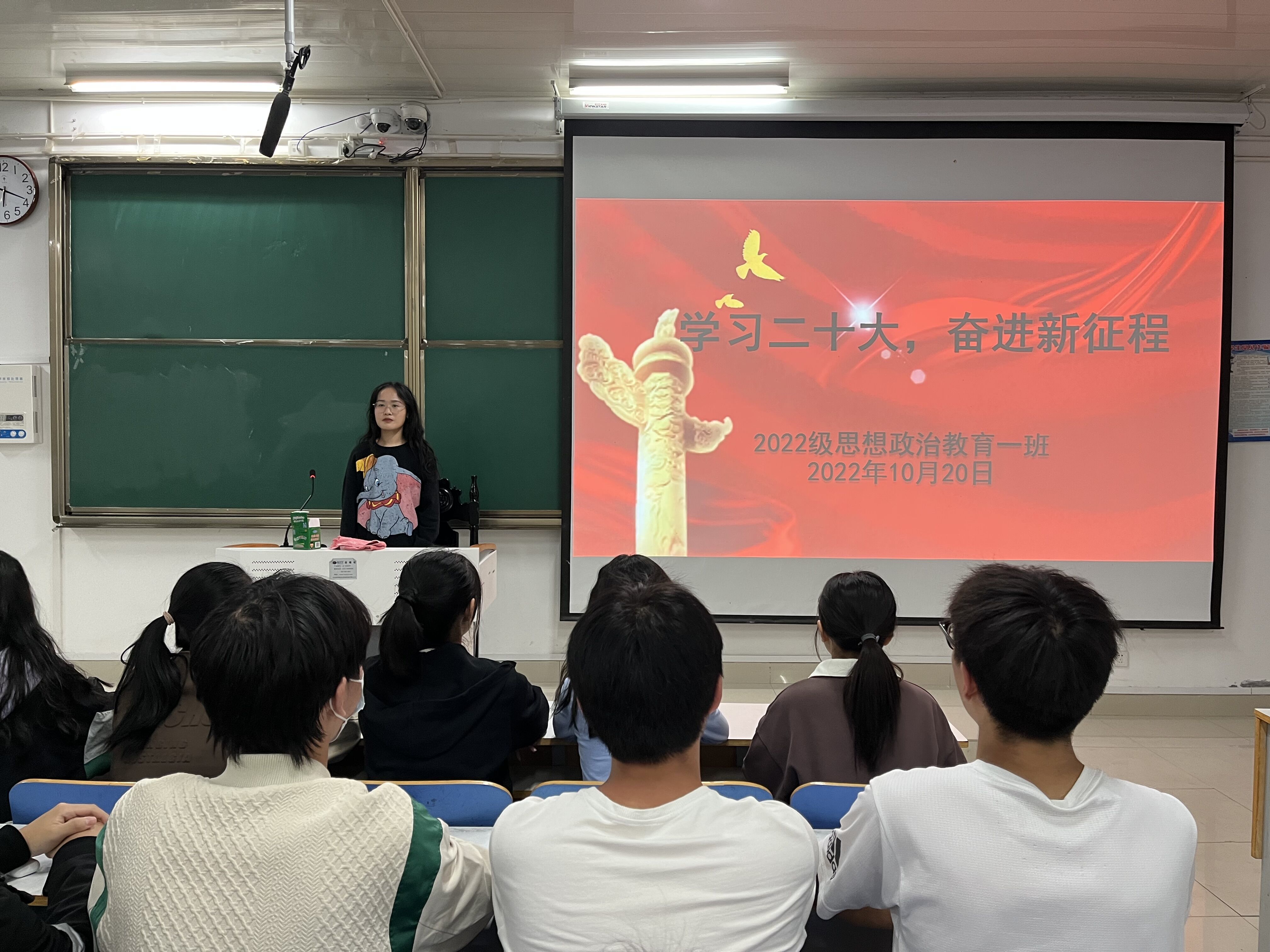 为教育引导同学们坚定理想信念,营造爱党爱国浓厚氛围,10月20日下午,太阳集团tyc59972022级思想政治教育一班在社科楼514召开“学习二十大,奋进新征程”主题班会,2022级思想政治教育一班全体同学参与本次班会,班会由学习委员司露主持。