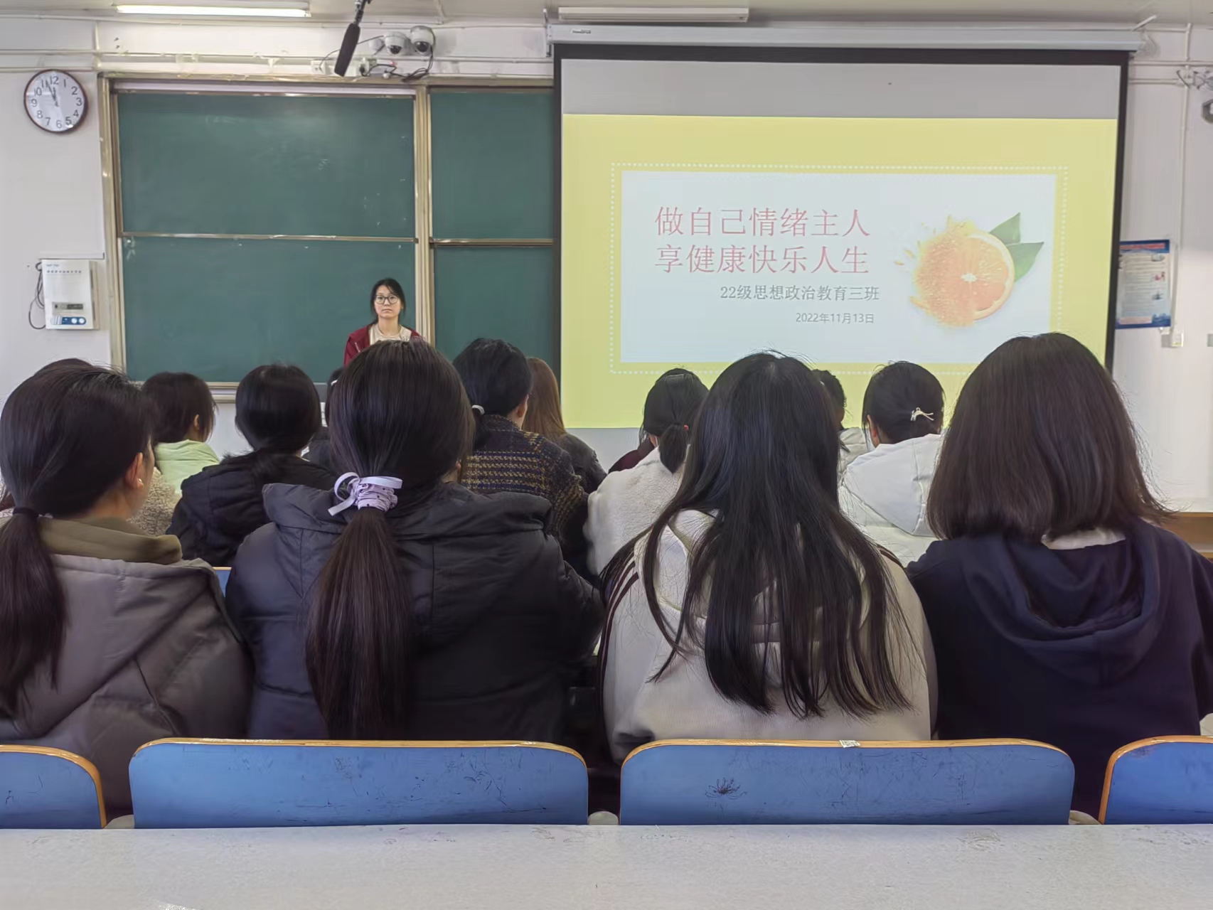 为进一步提高大学生心理素质,促进身心健康,11月13日上午,太阳集团tyc59972022级思想政治教育三班在社科楼514教室召开“做自己情绪主人,享健康快乐人生”主题班会。我院2022级思想政治教育三班全体成员共同参加班会,班会由心理委员张韶涵主持。