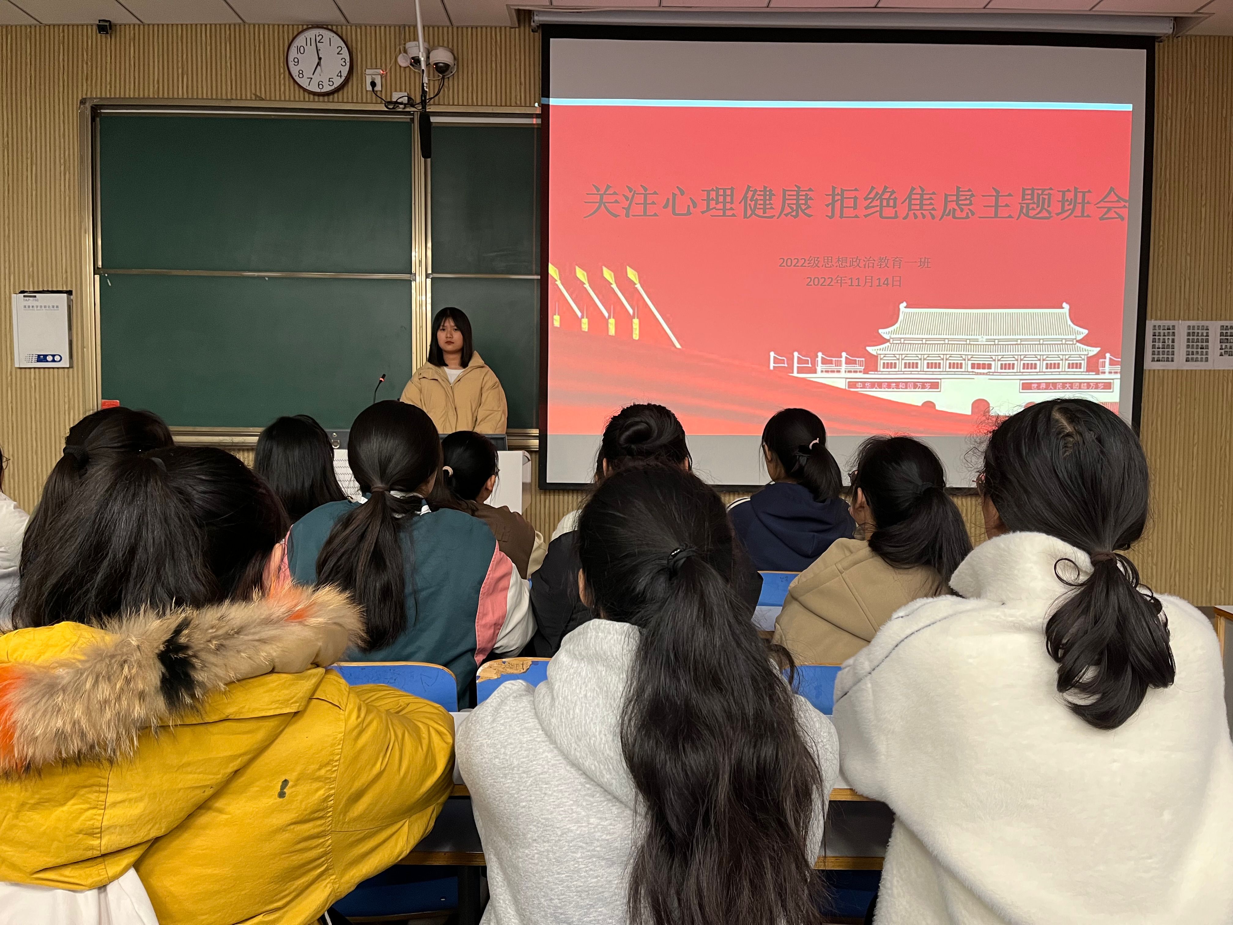 为加强心理健康教育,提高同学们心理健康素质,11月14日下午,太阳集团tyc59972022级思想政治教育一班在社科楼515教室召开“关注心理健康,拒绝焦虑”主题班会。2022级思想政治教育一班全体同学参与本次班会,班会由心理委员马思源主持。