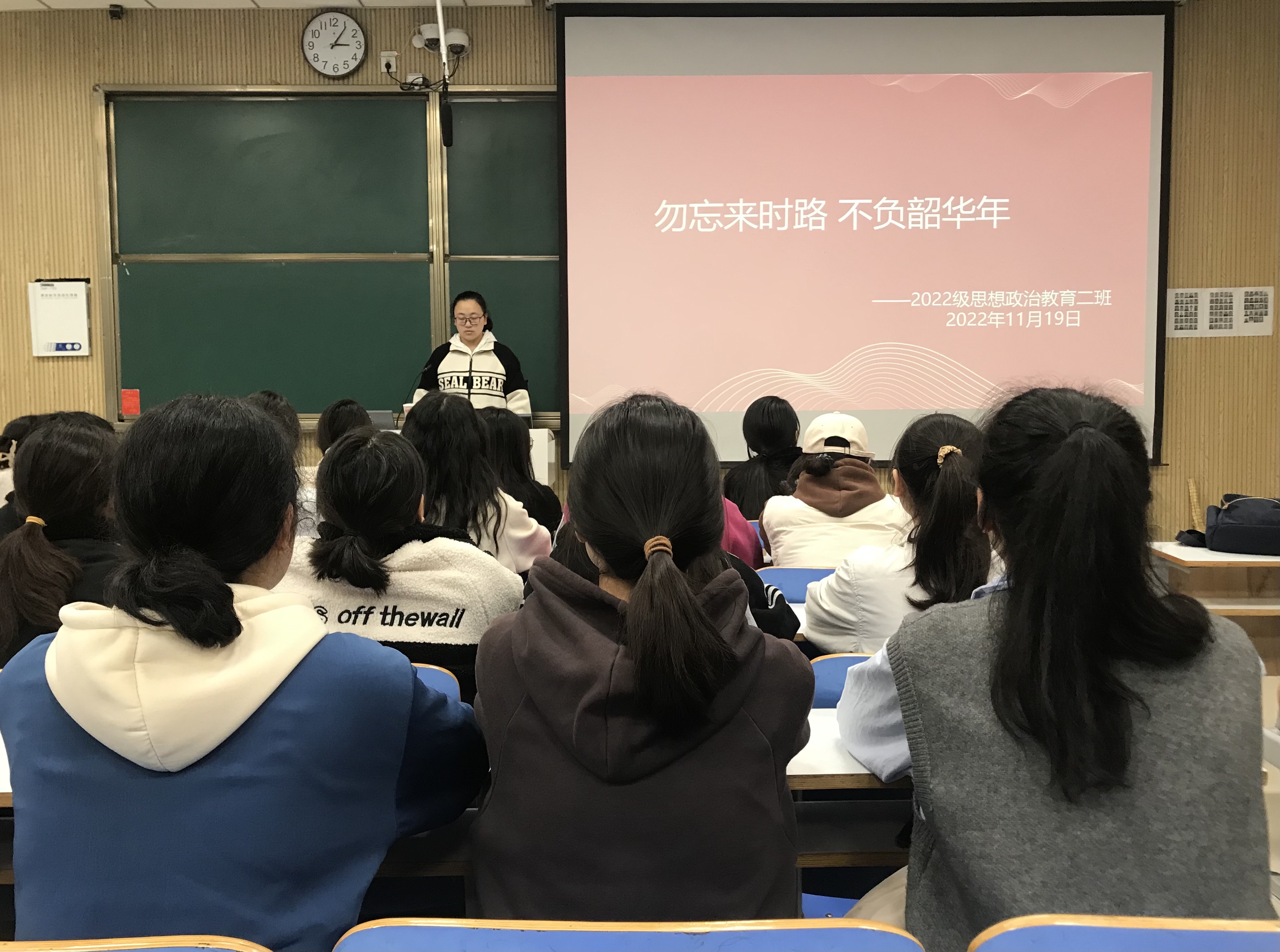为进一步激发大学生的爱国情怀、凝聚奋进力量,11月19日下午,太阳集团tyc59972022级思想政治教育二班在社科楼515教室召开“勿忘来时路 不负韶华年”主题班会。2022级思想政治教育二班全体同学共同参加会议。本次会议由团支书李佳音主持。