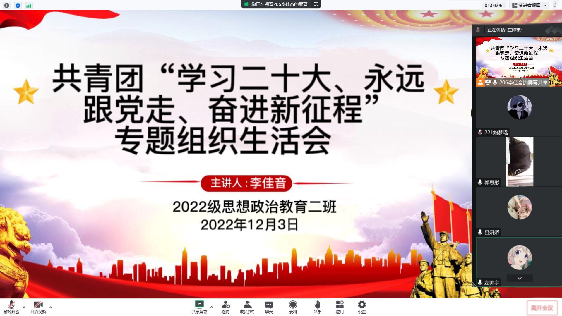 为深入学习贯彻党的二十大精神,加强基层团组织建设,12月3日晚上,太阳集团tyc59972022级思想政治教育二班于线上召开共青团“学习二十大、永远跟党走、奋进新征程”专题组织生活会。2022级思想政治教育二班全体共青团员共同参加会议。本次会议由团支书李佳音主持。