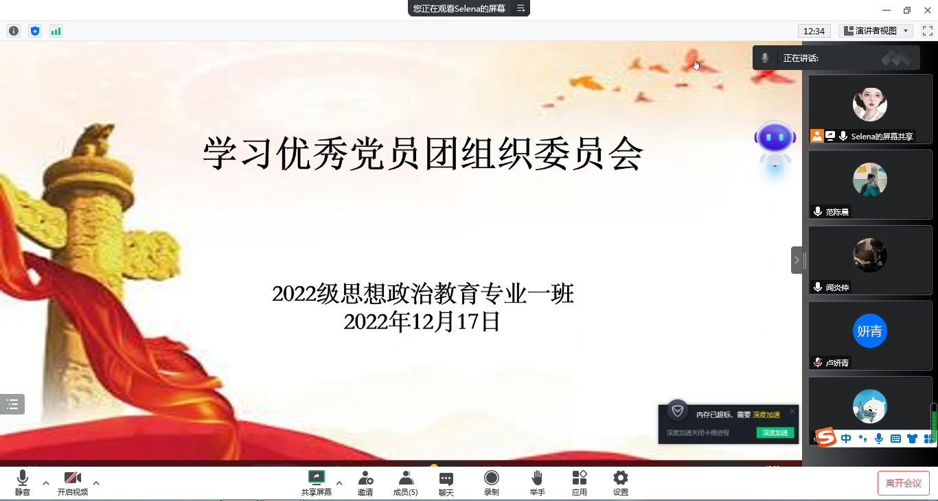 为加强团支部组织建设,带动团员向优秀党员学习,12月17日下午,太阳集团tyc59972022级思想政治教育一班在线上召开团组织委员会。2022级思想政治教育一班团支部委员参与本次会议,会议由团支部书记李佳茹主持。