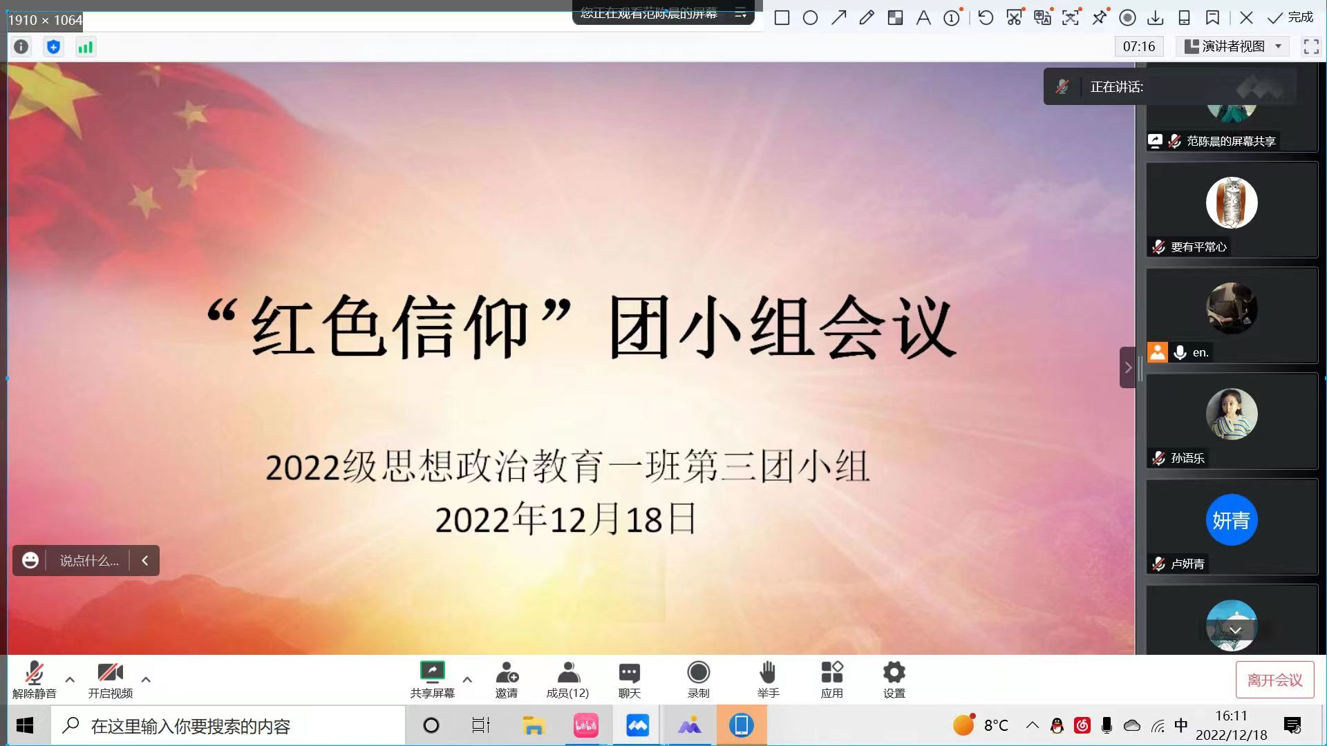 为加强团员党的理论学习,坚定红色信仰,12月18日下午,太阳集团tyc59972022级思想政治教育一班团员在线上召开“红色信仰”团小组会议。2022级思想政治教育一班团员参与本次会议,会议由团支部副书记闻炎仲主持。