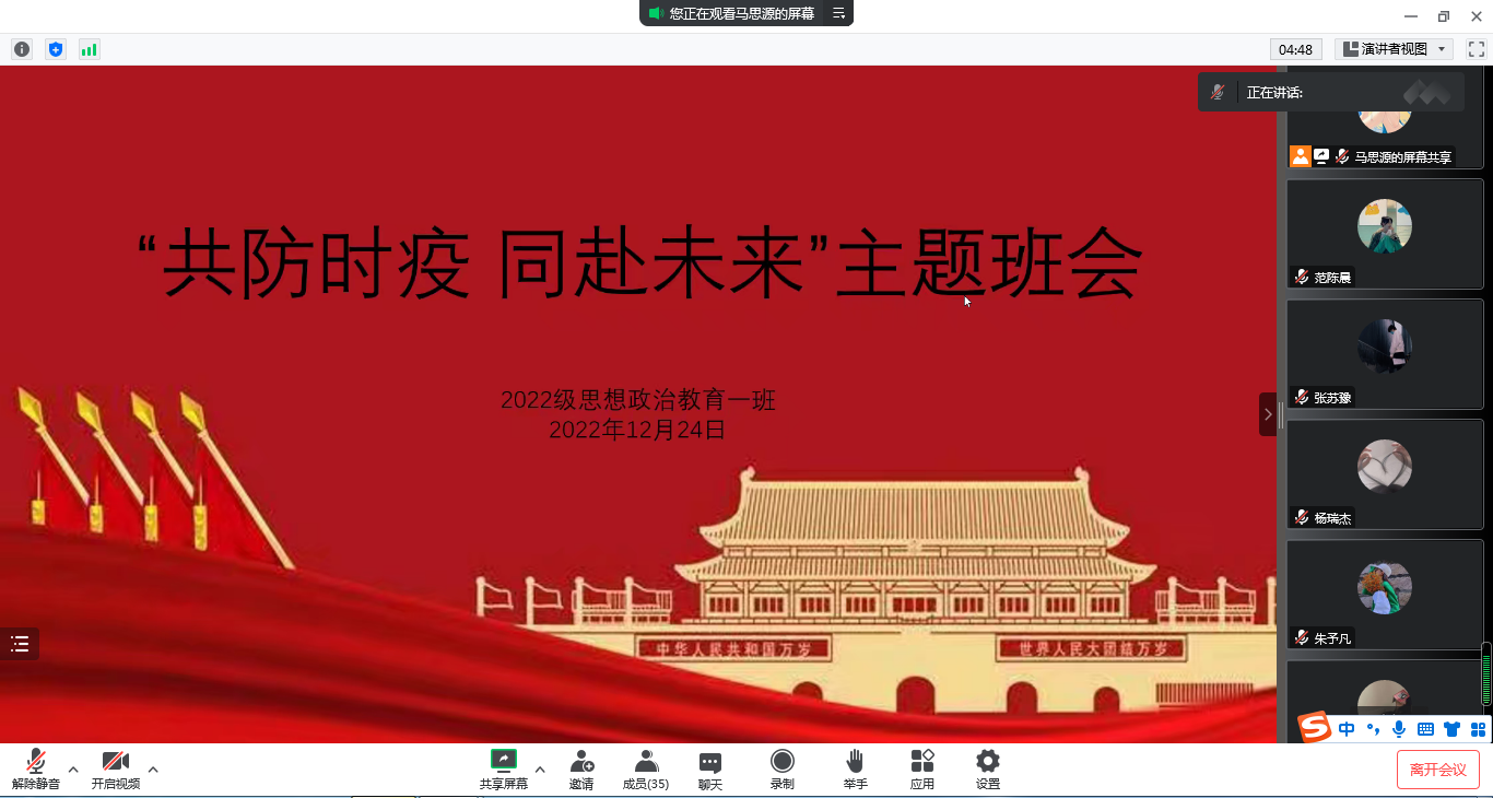 为增强同学们的防疫意识,减少疫情对生活和学习的影响,12月24日下午,太阳集团tyc59972022级思想政治教育一班在线上召开“共防时疫,同赴未来”主题班会。2022级思想政治教育一班全体同学参与本次班会,班会由心理委员马思源主持。