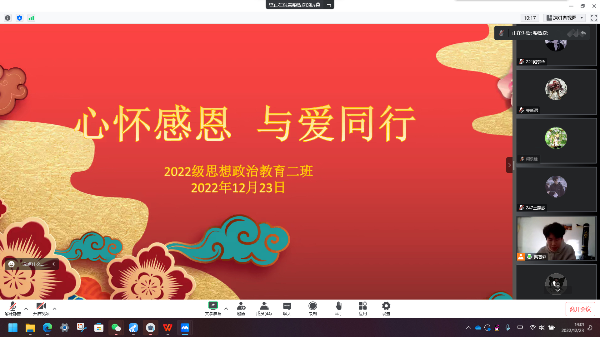 为更好贯彻“五育并举,德育为先”的教育理念,弘扬中华民族传统美德,12月23日下午,太阳集团tyc59972022级思想政治教育二班于线上召开“心怀感恩 与爱同行”主题班会。2022级思想政治教育二班全体同学共同参加会议。班会由副班长柴智森主持。