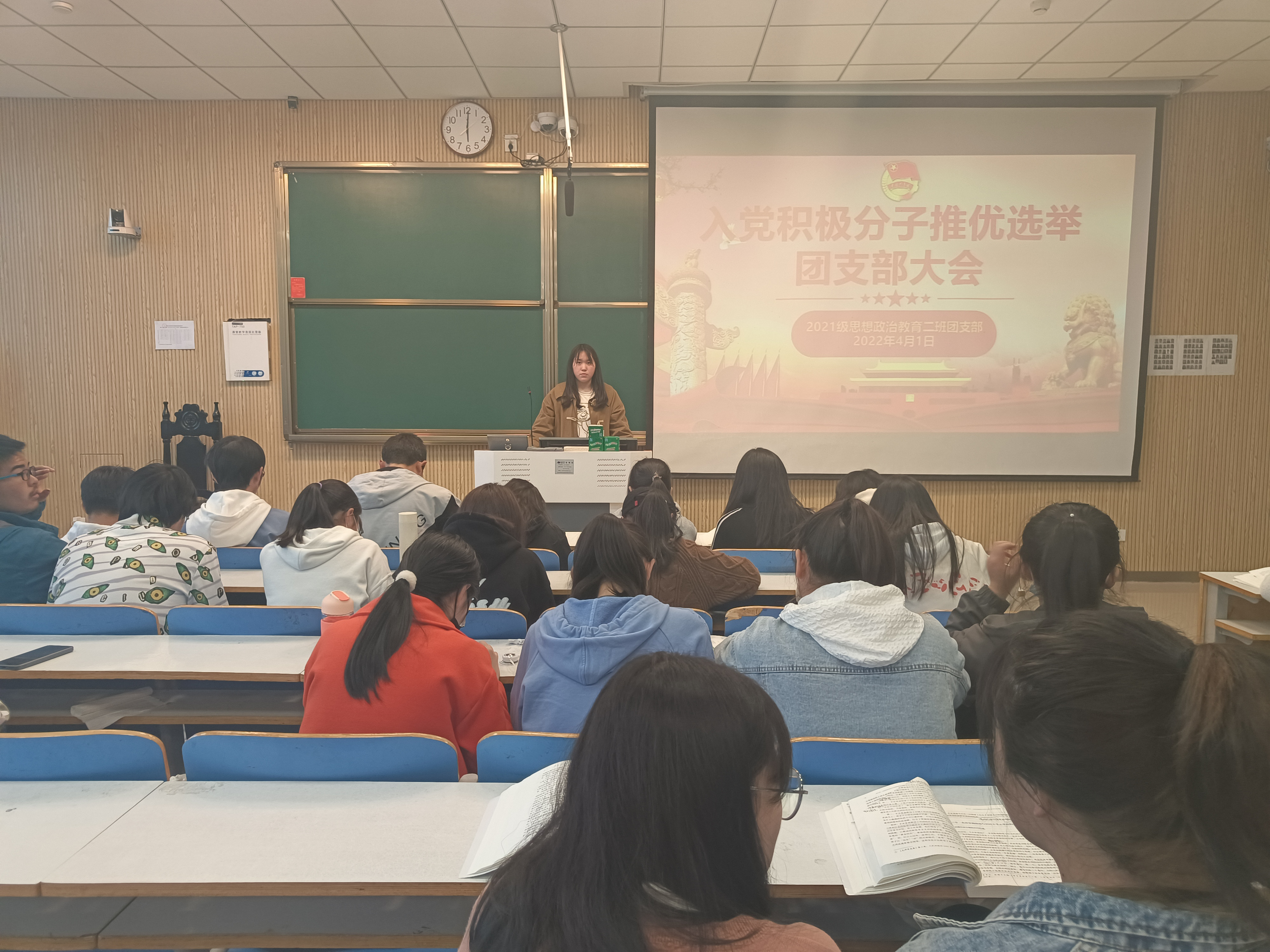 4月1日下午,太阳集团tyc59972021级思想政治教育二班在社科楼515教室召开入党积极分子推优选举团支部大会。2021级思想政治教育二班全体团员参与此次团支部大会,团支部大会由团支书王婧欣主持。