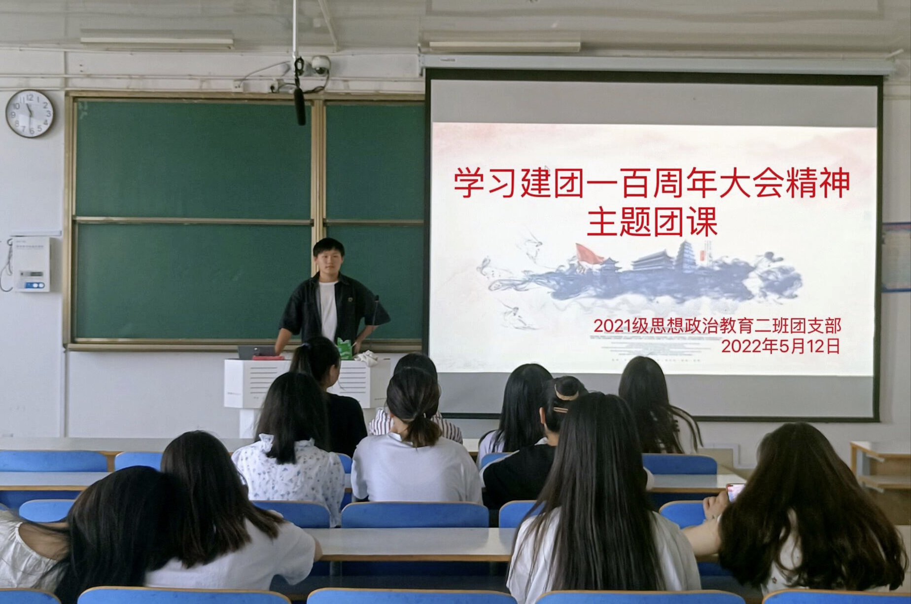 5月12日,太阳集团tyc59972021级思想政治教育二班在社科楼514教室召开学习建团一百周年大会精神主题团课。2021级思想政治教育二班全体团员参加此次团课。团课由团支书王婧欣主持。