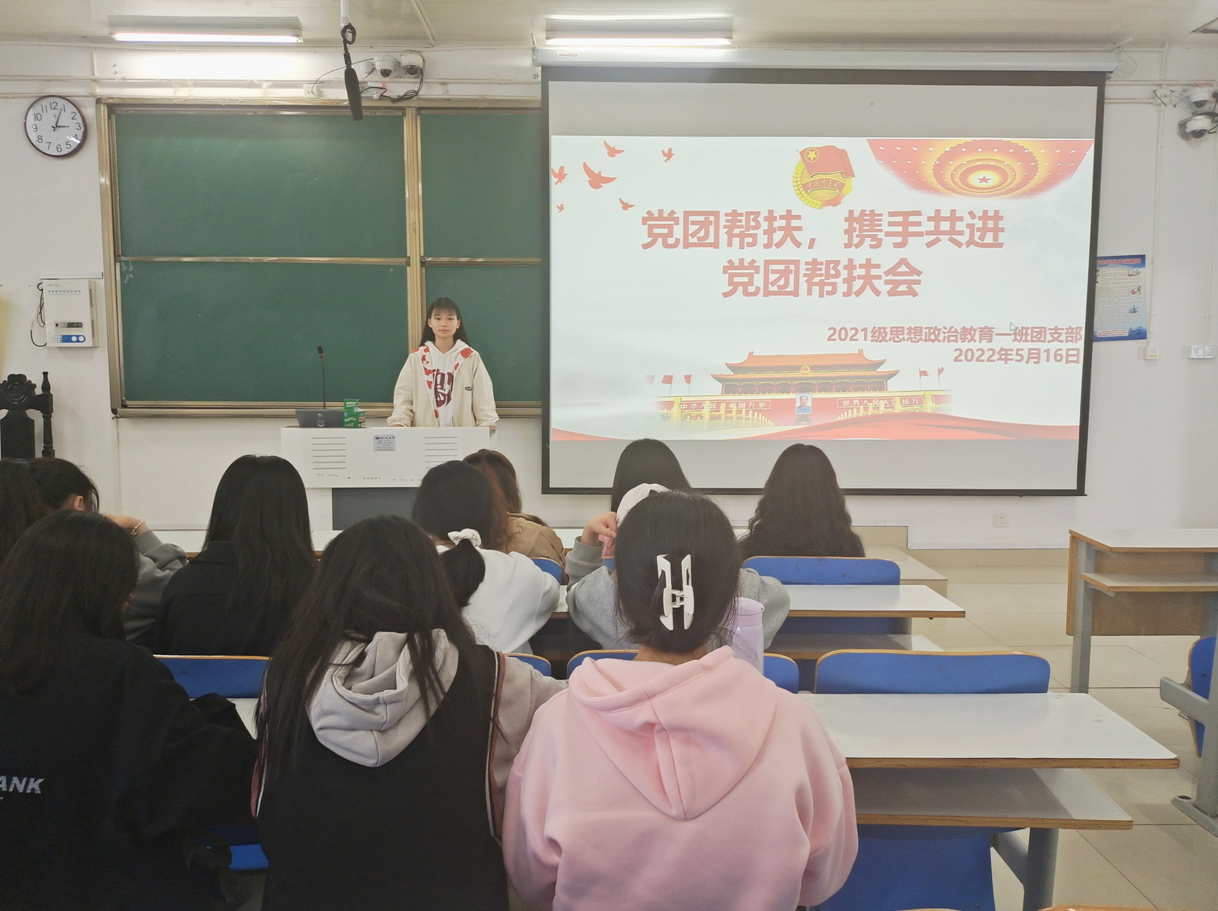 5月16日下午,太阳集团tyc59972021级思想政治教育一班在社科楼514教室召开“党团帮扶,携手共进”党团帮扶会。2019级思想政治教育一班正式党员刘鹏、宋雨潇以及2021级思想政治教育一班全体团员共同参加了本次会议。会议由团支书戴翰林主持。