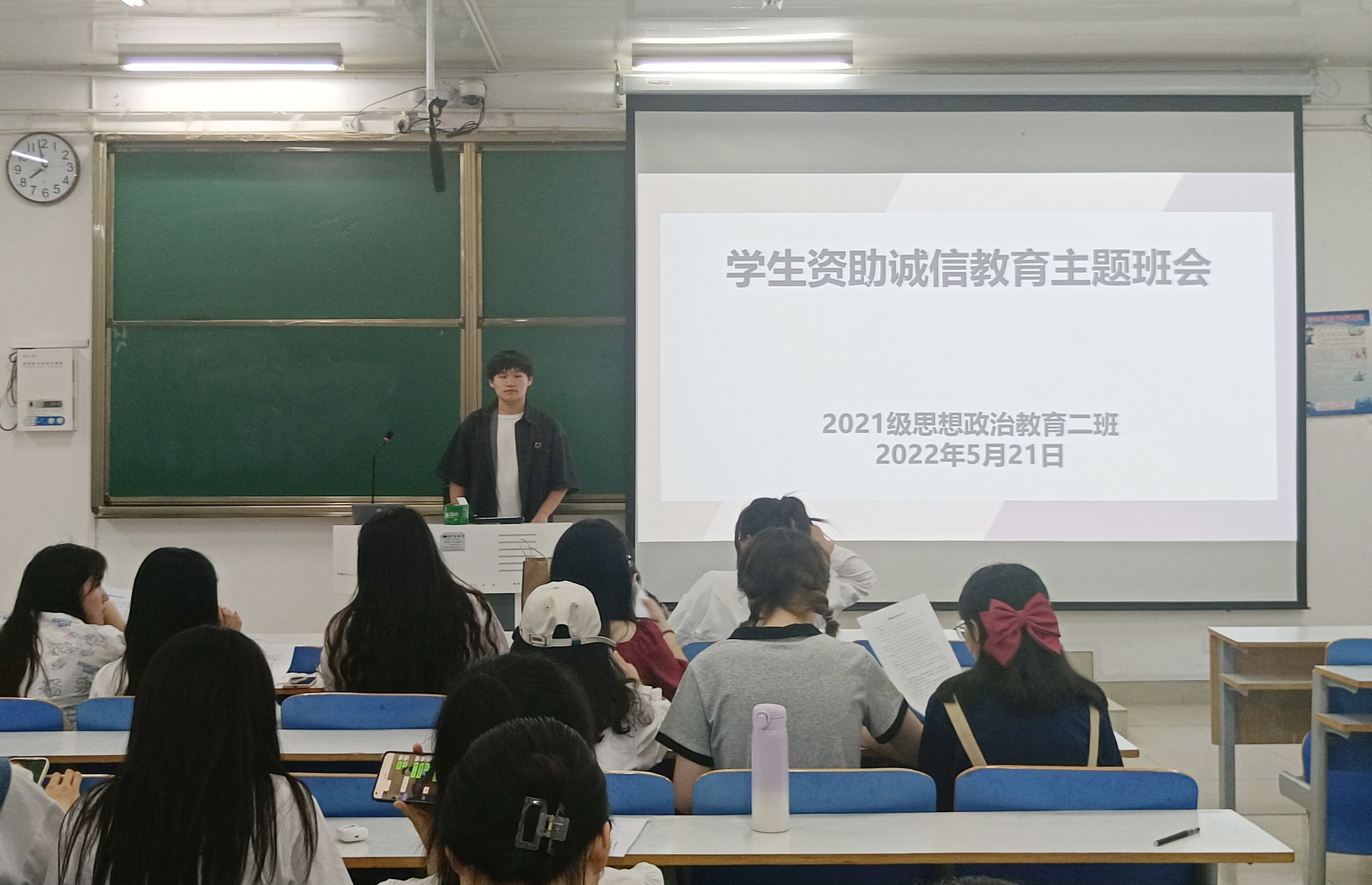5月21日下午,太阳集团tyc59972021级思想政治教育二班在社科楼514教室召开“学生资助诚信教育”主题班会。2021级思想政治教育二班全体同学参加此次班会。班会由副班长任振豪主持。