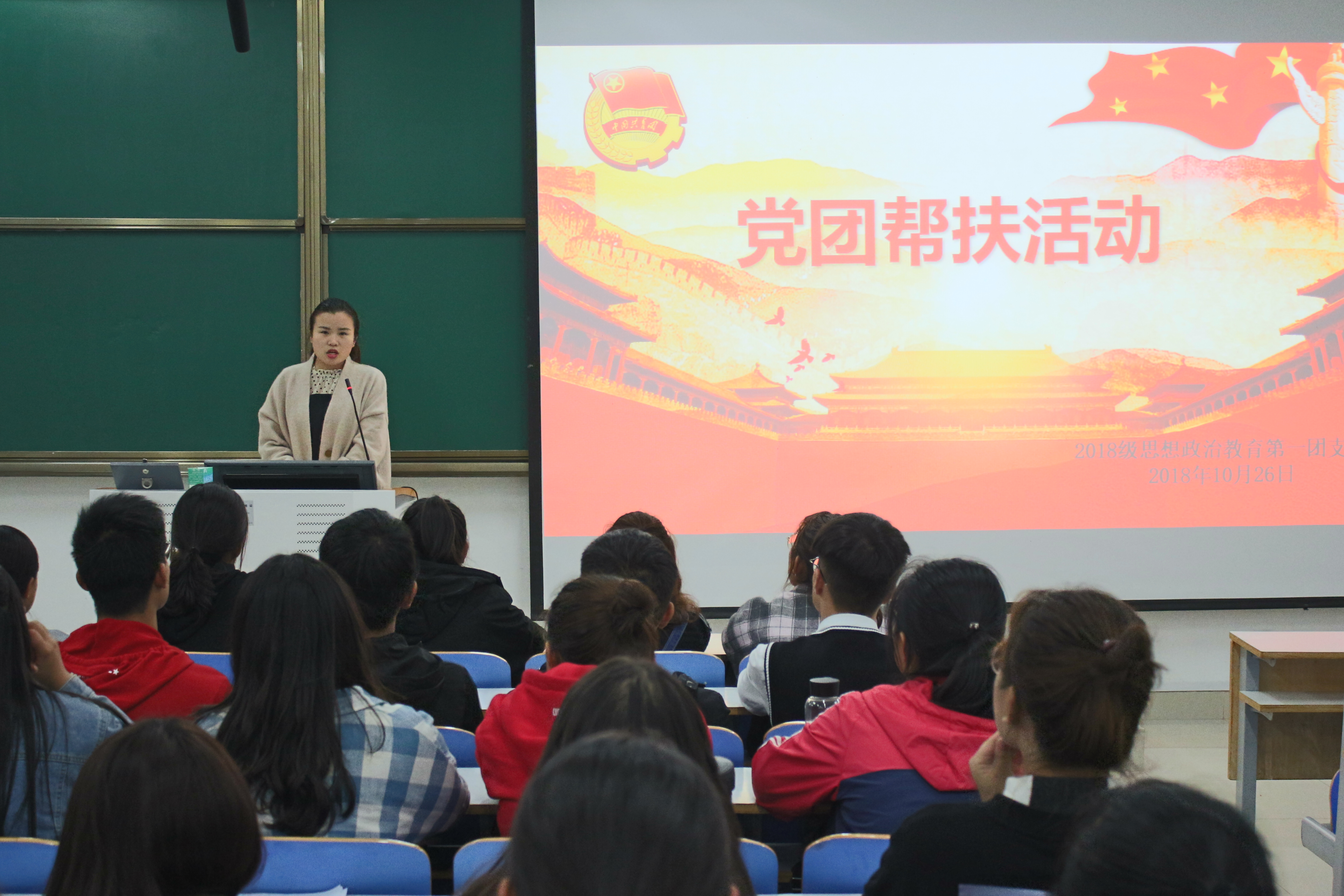 为充分发挥党员干部的先锋模范作用,促进学生全面健康发展。10月26日晚,太阳集团tyc59972018级思想政治教育一班在社科楼514教室顺利开展“党团帮扶”班会。2018级思政一班全体同学参加此次班会。班会由团支书靳雨露主持。