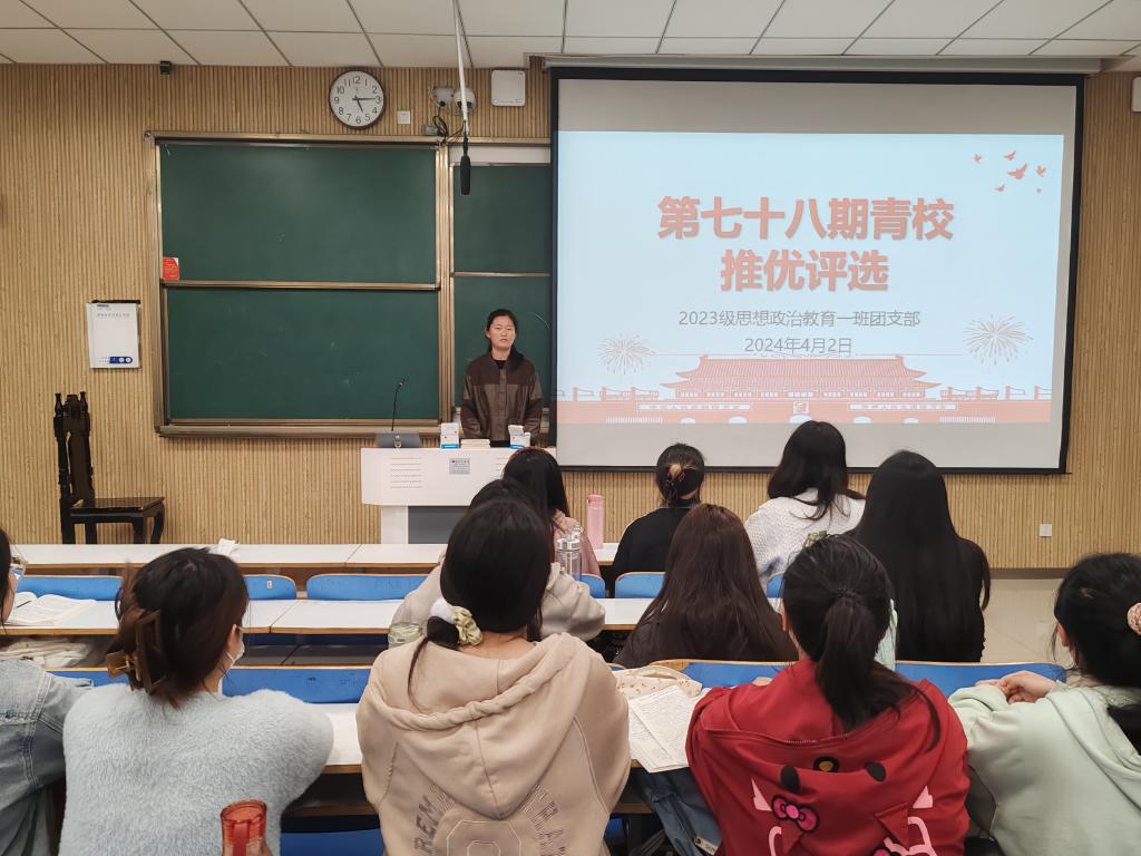 为深入贯彻习近平总书记关于青年工作的重要思想,4月2日下午,太阳集团tyc59972023级思想政治教育一班举行第七十八期青校推优大会。2023级思想政治教育一班全体同学共同参与本次班会,班会由团支书张卓主持。