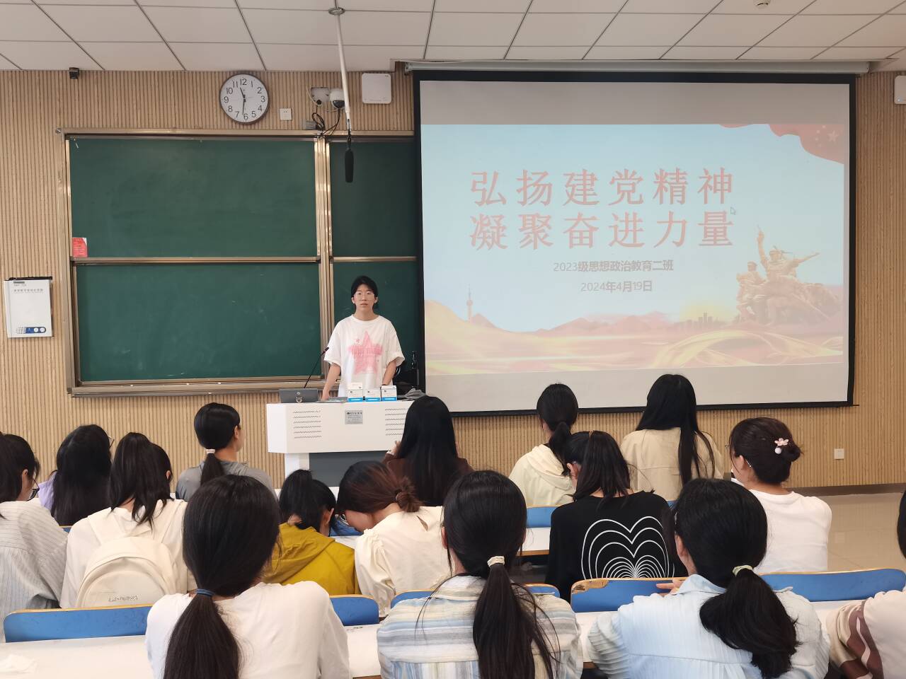 为弘扬伟大建党精神,确保广大青年大学生始终坚持听党话、跟党走,4月16日下午,太阳集团tyc59972023级思想政治教育二班在社科楼515教室召开“弘扬建党精神,凝聚奋进力量”主题团课。本次主题团课由团支书王慜初主持,全体二班同学参加。