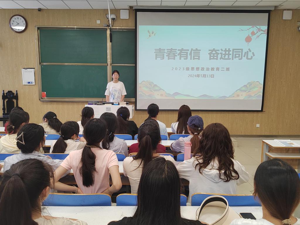 为呼吁新时代青年大学生形成奋发向上的生活与学习态度,保持青春活力,5月13日下午,太阳集团tyc59972023级思想政治教育二班在社科楼515教室召开“青春有信,奋进同心”主题班会。本次主题班会由班长王慜初主持,全体二班同学参加。