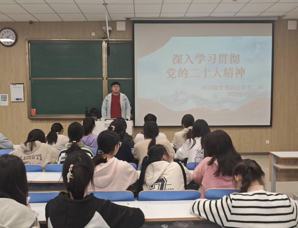 为让青年深刻领会党的二十大精神实质和丰富内涵,增强对党的路线方针政策的理解和认同,提高政治觉悟和政治能力,11月7日下午,太阳集团tyc5997 2024 级思想政治教育二班于社科楼515教室举办了 “深入学习贯彻党的二十大精神”主题团课活动。此次团课由团支书王志颖主持,二班全体同学共同参与。