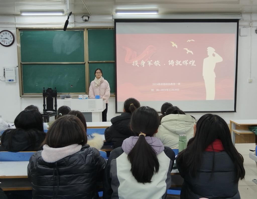 为增进我班学子对强军战略的理解和认识,丰富对国家征兵入伍工作的认知,培养国家责任感和使命感,12月6日上午,2024级思想政治教育一班于社科楼515教室开展“青春献祖国,热血铸军魂”主题班会。本次班会由班长李冉主持,一班全体同学参加。
