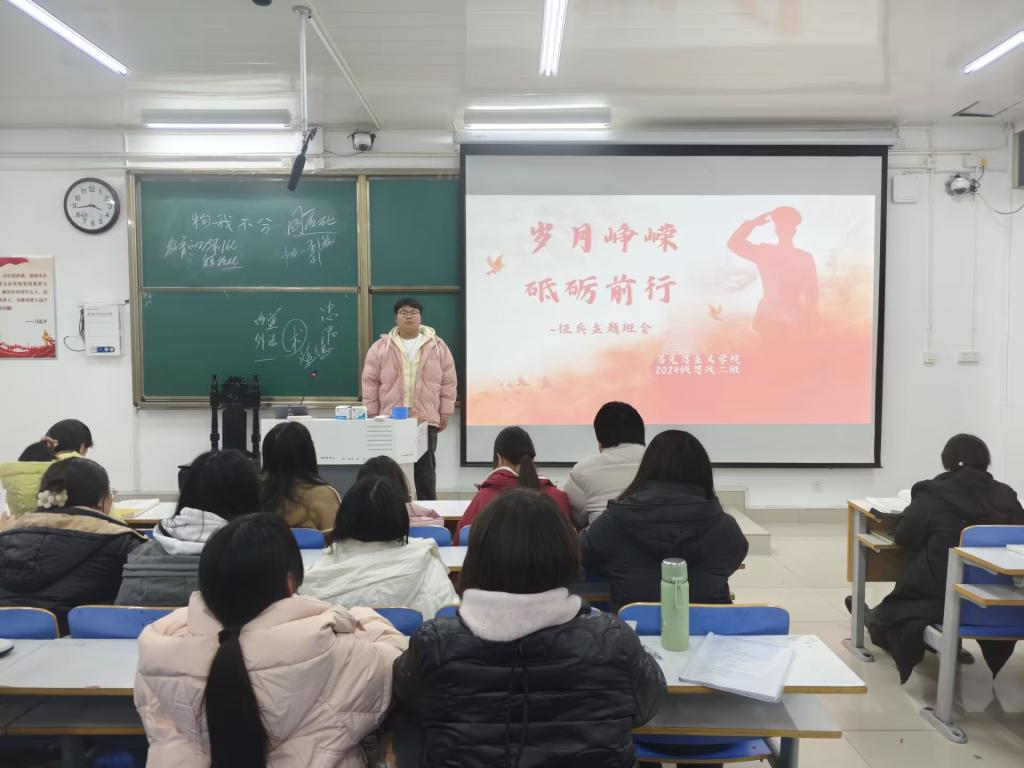 为弘扬爱国主义精神,激发青年学生的参军报国热情,12月10日下午,太阳集团tyc59972024级思想政治教育二班在社科楼515教室举办了“岁月峥嵘,砥砺前行”主题征兵班会。此次班会由班长王志颖主持,二班全体同学积极参与。