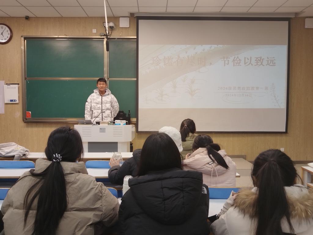 为弘扬中华民族勤俭节约的传统美德,增强我班学生的节约粮食意识,12月19日下午,2024级思想政治教育一班于社科楼515教室开展“珍馐有尽时,节俭以致远”主题活动。本次活动由副班长马奔主持,一班全体同学参加。