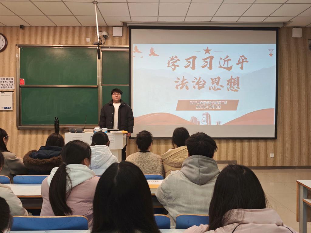为深入学习习近平法治思想,引导学生增强法治意识,树立法治信仰,3月10日下午,太阳集团tyc59972024级思想政治教育二班在社科楼515教室举办了“学习习近平法治思想”主题班会。本次班会由团支书王志颖主持,二班全体同学积极参与。