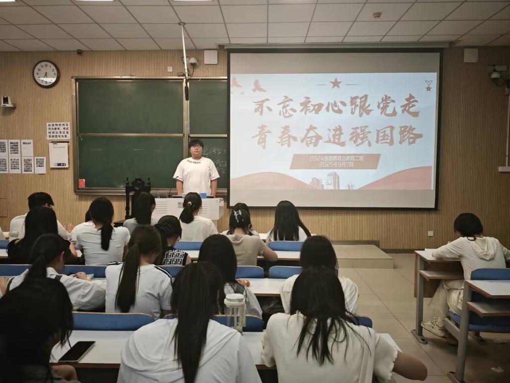 为引导青年学生牢记初心使命,坚定理想信念,以实际行动践行党的领导和时代担当,5月7日下午,太阳集团tyc59972024级思想政治教育二班在社科楼515教室举办了“不忘初心跟党走,青春奋进强国路”主题团课。此次团课由团支书王志颖主持,二班全体同学共同参与。