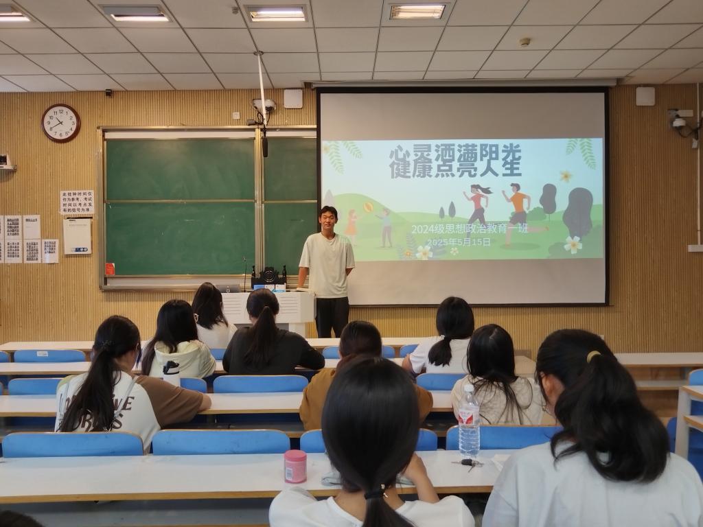为提升我班学生心理健康意识,促进其身心健康全面发展,5月15日下午,2024级太阳集团tyc5997思想政治教育一班于社科楼515教室开展“心灵洒满阳光,健康点亮人生”主题班会。本次班会由副班长马奔主持,一班全体同学参加。