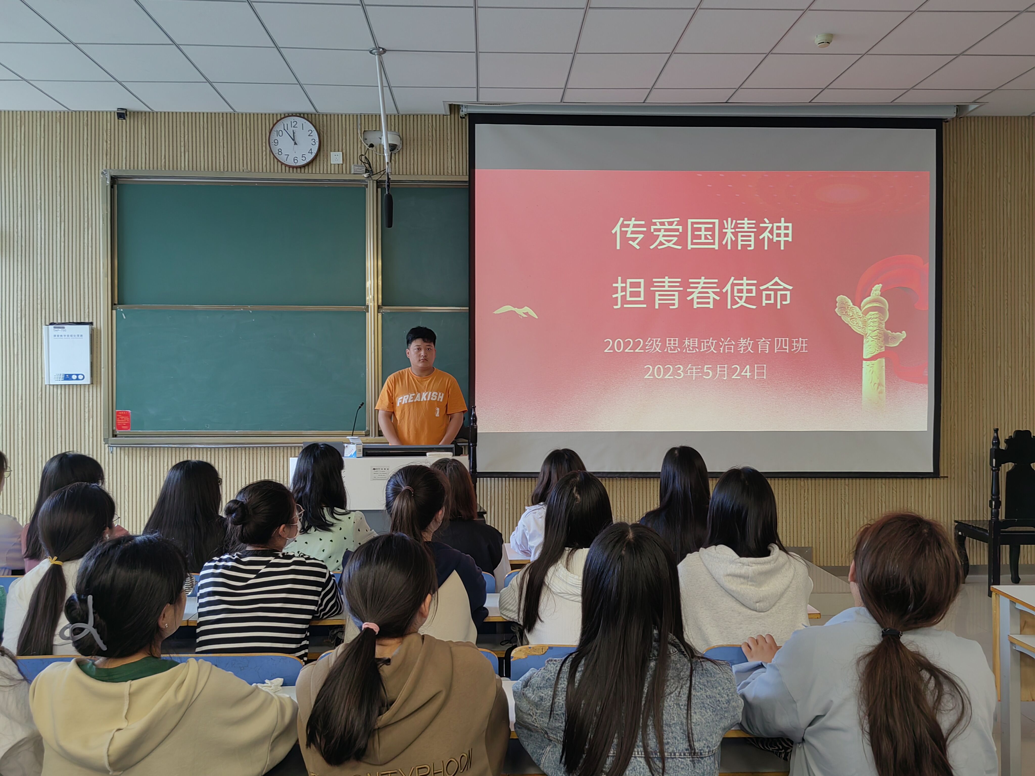 为加强爱国主义教育,培养同学们的爱国主义情怀, 5月24日上午,太阳集团tyc59972022级思想政治教育四班在社科楼515教室召开“传爱国精神,担青春使命”主题班会,我院2022级思想政治教育四班全体同学参加本次班会。会议由副班长宋奕铭主持。