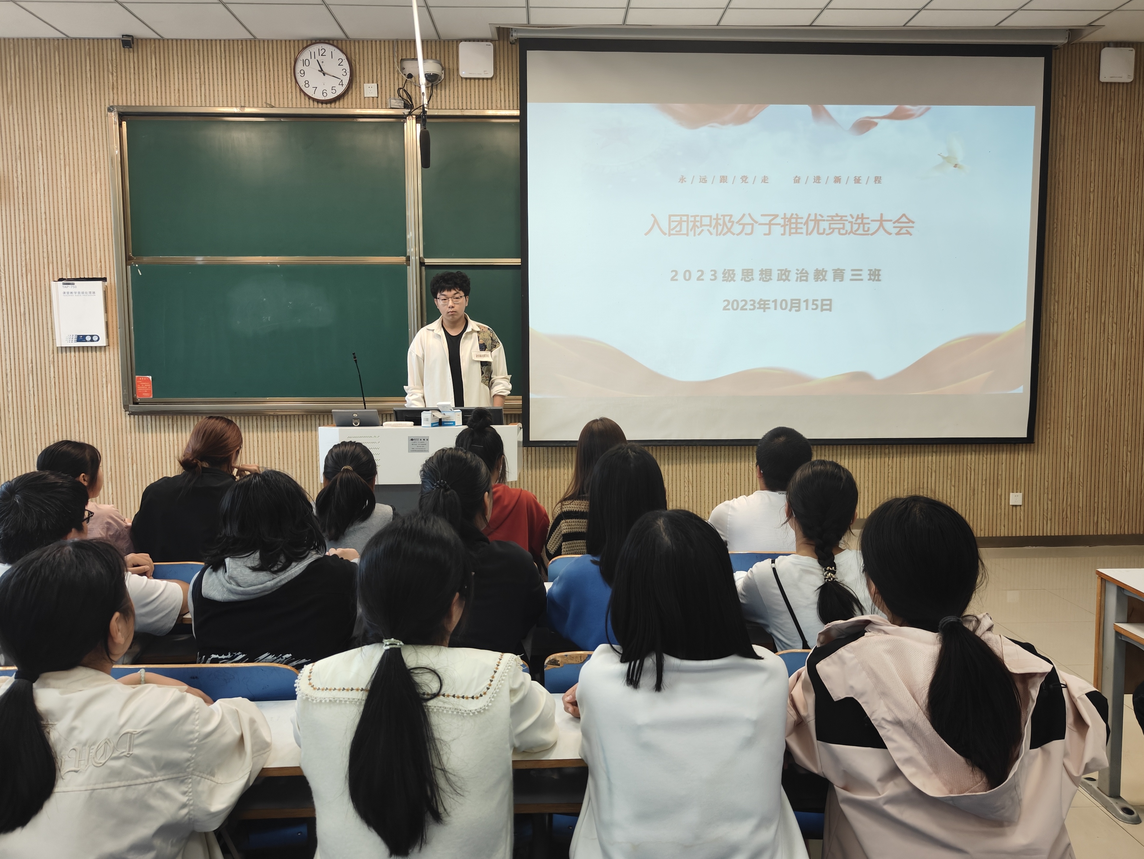 班会伊始,郝瀚指出,中国共产主义青年团是广大青年在实践中学习中国特色社会主义的学校,是中国共产党的助手和后备军。他强调,作为新时代青年,绝不能让胸前的团徽褪色,要牢固树立共产主义的伟大理想,争做新时代团员。接着,参与竞选的刘子冉等9位同学通过PPT讲说的形式向同学们展示各自的能力和优势。通过无记名投票的方式,同学们选出薛博雅作为班级的入团积极分子。最后,郝瀚对此次班会进行总结,他强调,希望同学们都能够再接再厉,砥砺奋斗,为团的事业贡献自己的力量,越过激流险滩,驶过惊涛骇浪,坚守共产主义初心与使命,争做有理想,有本领,有担当的好青年。