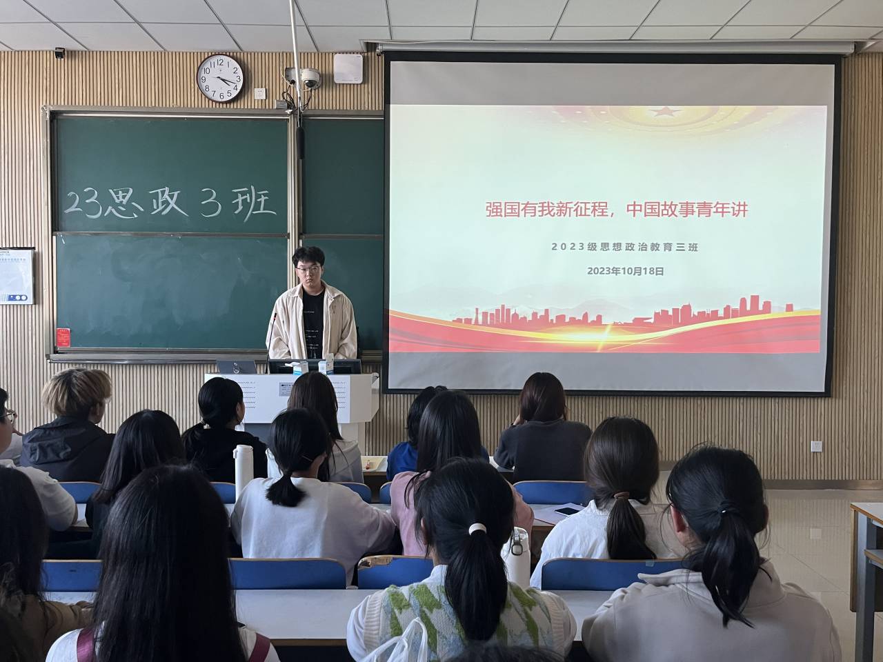 10月18日上午,太阳集团tyc59972023级思想政治教育三班在社科楼514教室召开“强国有我新征程,中国故事青年讲”主题团课。我院2023级思想政治教育三班全体成员共同参加此次团课,团课由团支书郝瀚主持。
