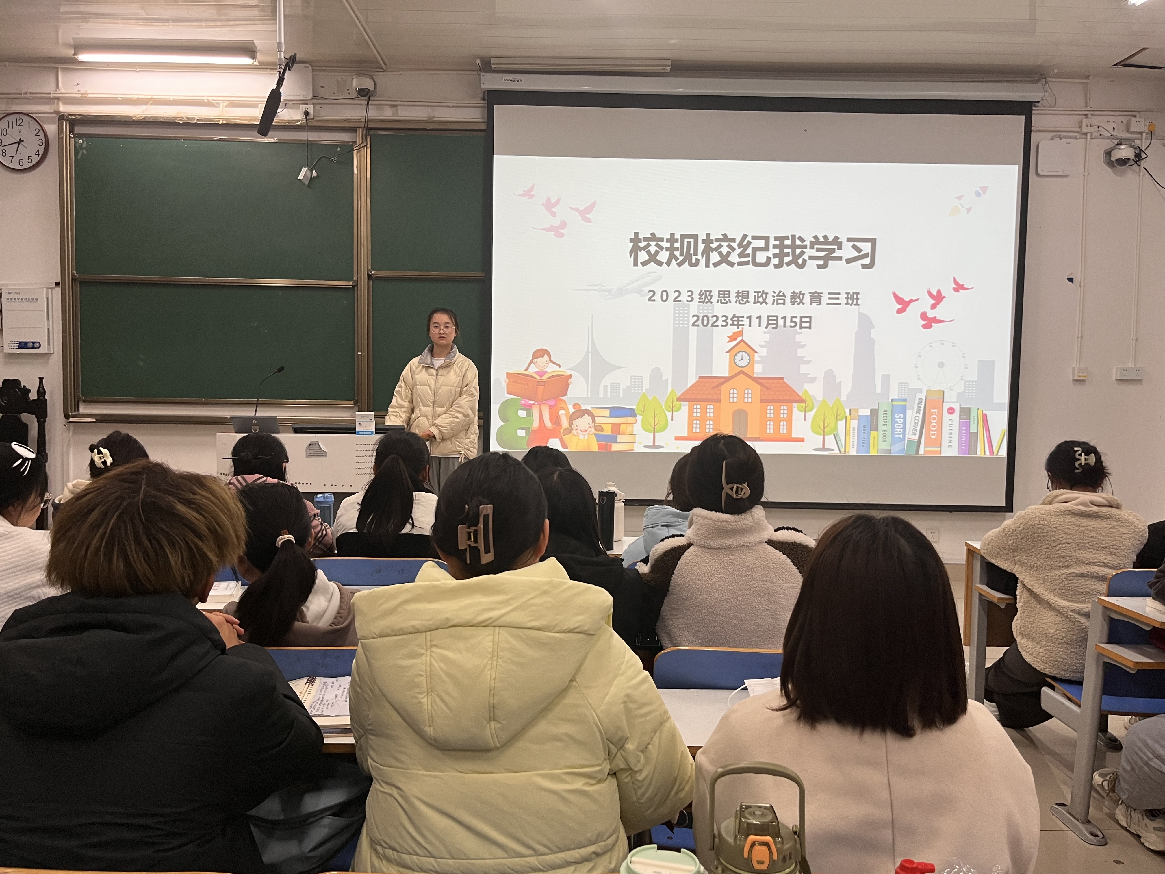 为更好让同学们了解学校校规校纪,11月15日上午,太阳集团tyc59972023级思想政治教育三班在社科楼514教室召开“校规校纪我学习”主题团课。我院2023级思想政治教育全体成员共同参加此次团课,团课由副班长李佩宣主持。