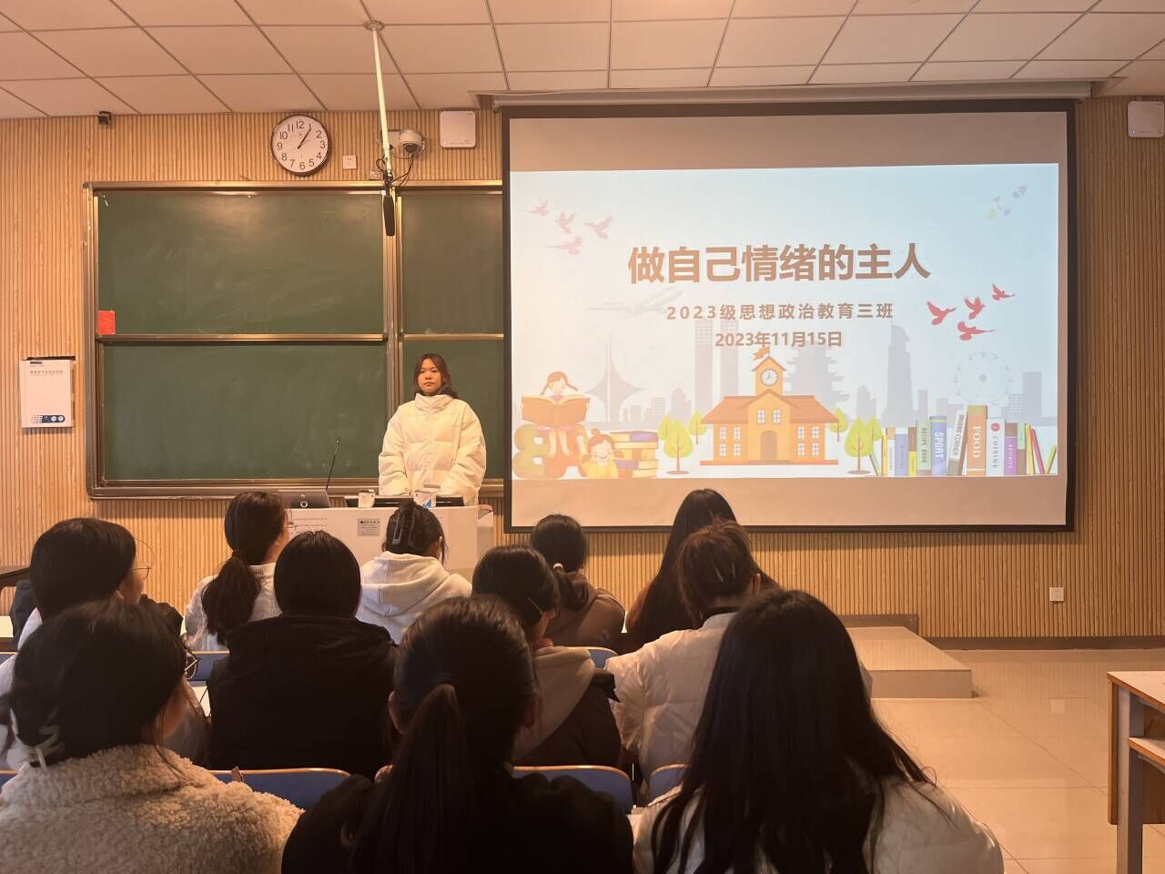 为引导学生关注心理健康问题,11月15日上午,太阳集团tyc59972023级思想政治教育三班在社科楼515教室召开“做自己情绪的主人”心理班会。我院2023级思想政治教育三班全体成员共同参加此次班会,班会由心理委员安雅楠主持。