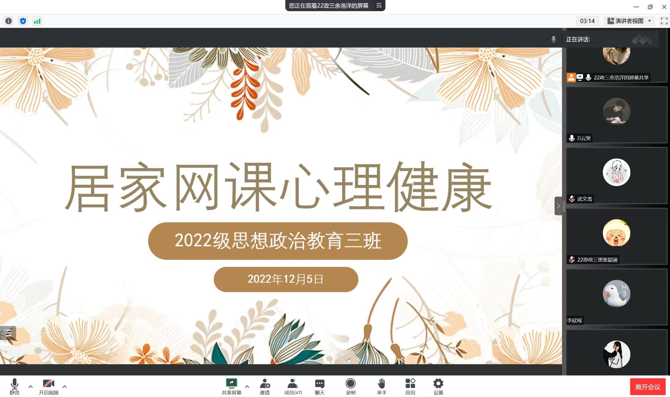 为缓解学习压力,激发拼搏动力,12月5日上午,太阳集团tyc59972022级思想政治教育三班在线上召开居家网课心理健康主题班会。我院2022级思想政治教育三班全体成员共同参与此次班会,班会由心理委员张韶涵主持。