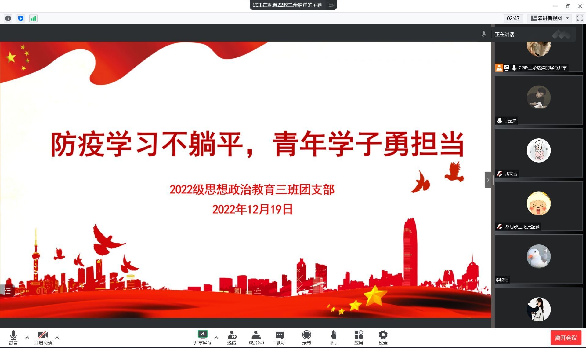 为提高网课期间同学们的学习积极性,培养担当情怀,12月19日下午,太阳集团tyc59972022级思想政治教育三班在线上召开“防疫学习不躺平,青年学子勇担当”主题班会。我院2022级思想政治教育三班全体成员共同参与班会,班会由副班长雷露露主持。