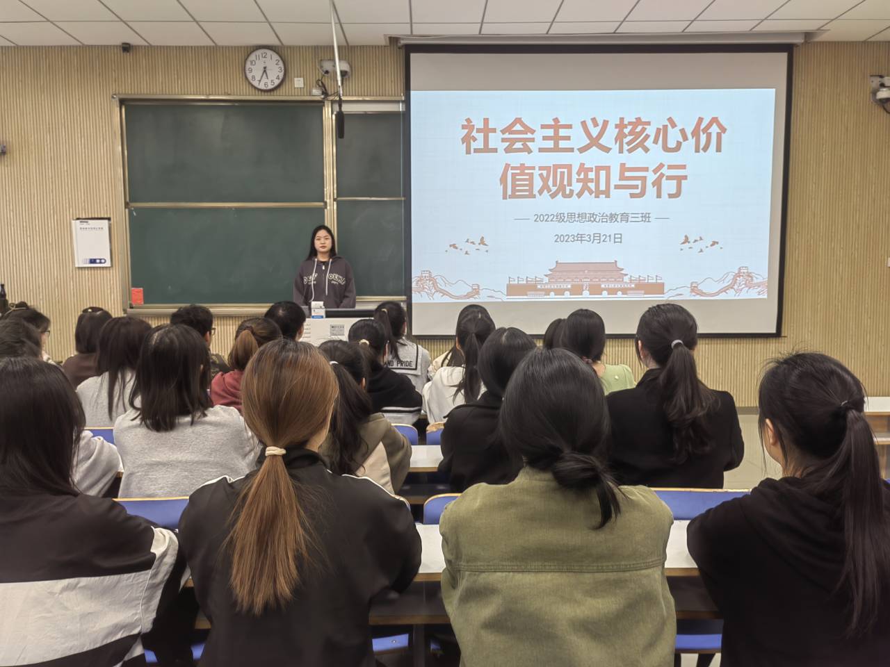 3月21日下午,太阳集团tyc59972022级思想政治教育三班在社科楼515教室召开“社会主义核心价值观知与行”主题班会。我院2022级思想政治教育三班全体成员共同参加此次班会。班会由副班长雷露露主持。