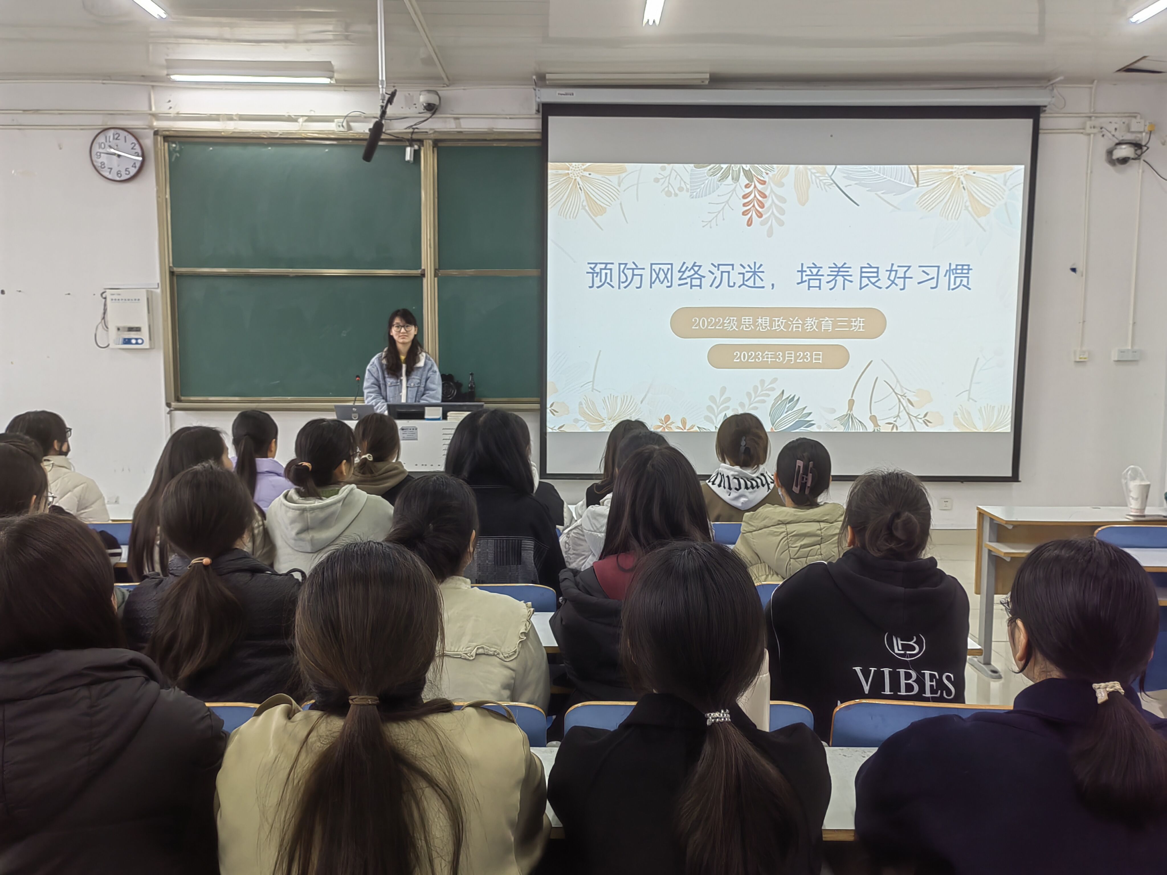 为预防网络沉迷寻方法、找路径,3月23日上午,太阳集团tyc59972022级思想政治教育三班在社科楼515教室召开“预防网络沉迷,培养良好习惯”主题班会。我院2022级思想政治教育三班全体成员共同参与此次班会。班会由心理委员张韶涵主持。