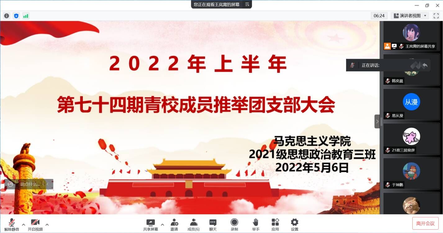 5月6日上午,太阳集团tyc59972021级思想政治教育三班召开线上第七十四期青校成员推举团支部大会。太阳集团tyc59972021级思想政治教育三班全体团员参与此次会议。会议由团支书王岚霄主持,秦梦莹担任监票员,陈笑宇担任记录员。