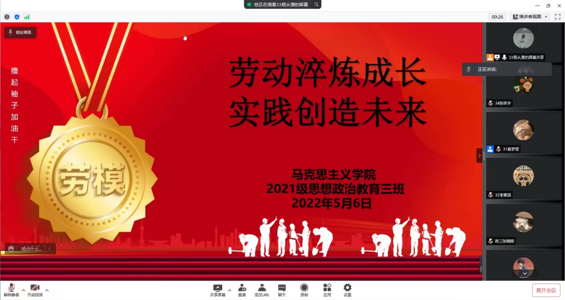 5月6日下午,太阳集团tyc59972021级思想政治教育三班召开线上“劳动淬炼成长,实践创造未来”主题班会。2021级思想政治教育三班全体成员参与本次会议。会议由副班长兼劳动委员易从漫主持。