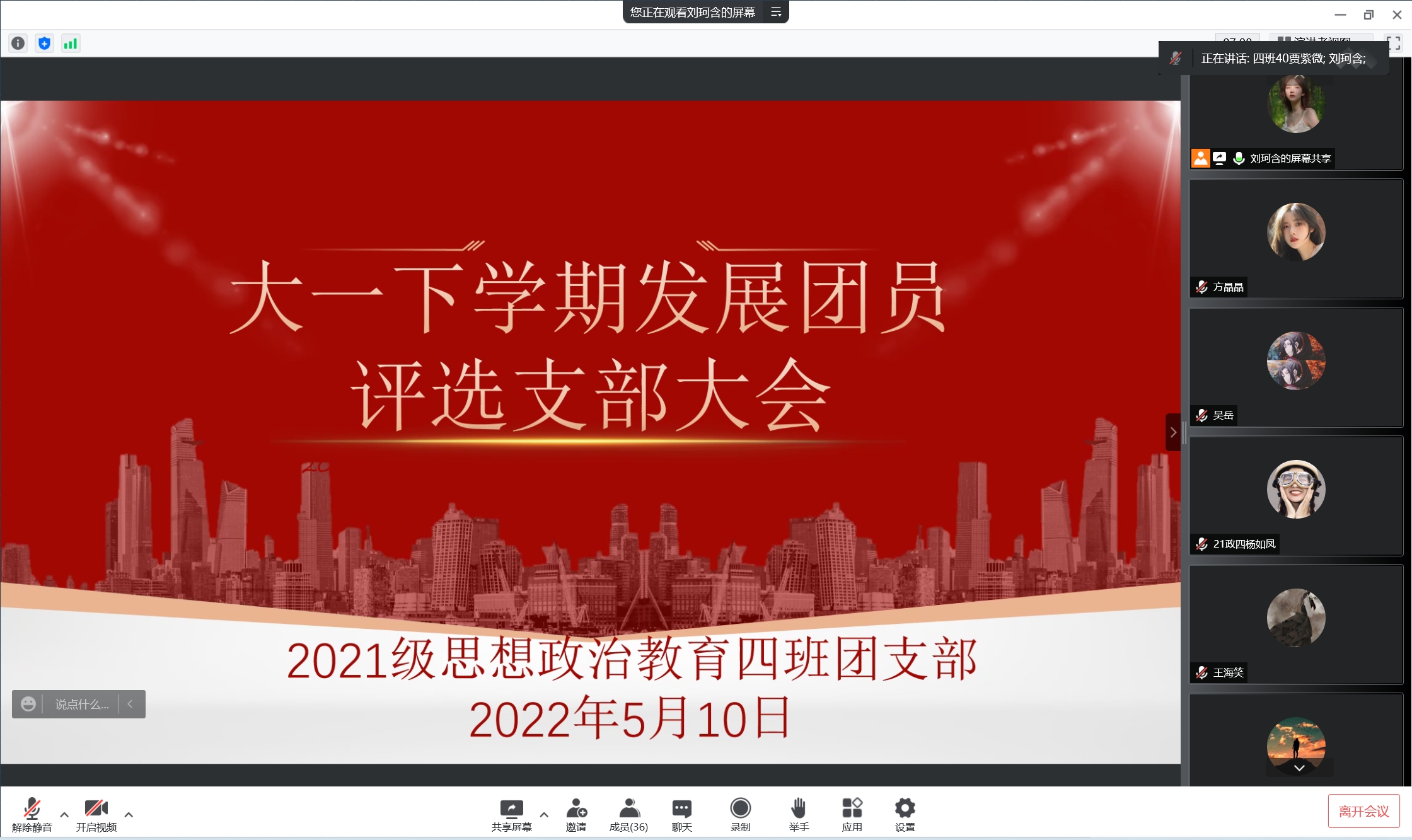 5月10日晚,太阳集团tyc59972021级思想政治教育四班线上召开大一下学期发展团员民主评议会。2021级思想政治教育四班全体团员共同参会。会议由团支书刘珂含主持。