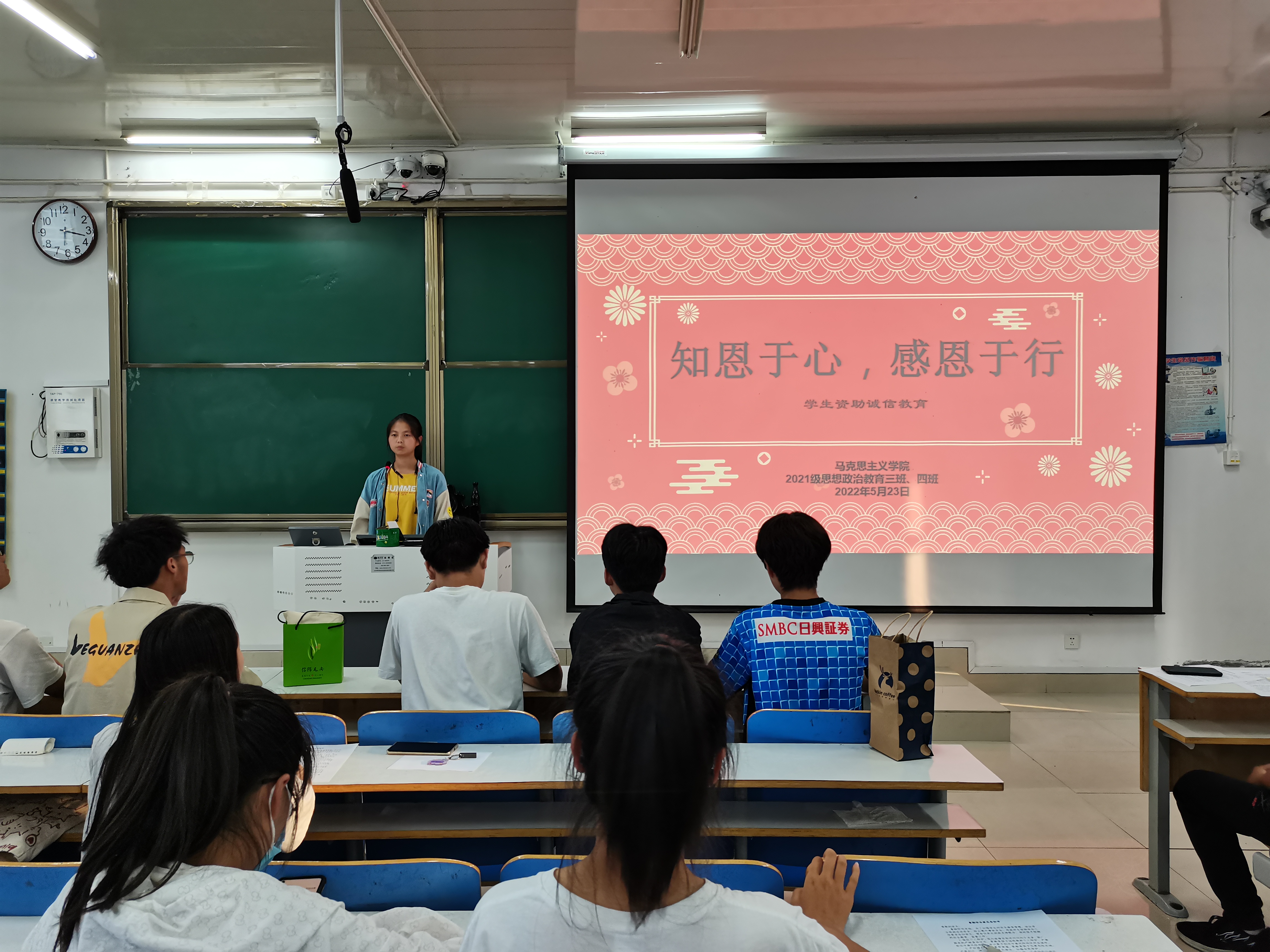 5月23日下午,太阳集团tyc59972021级思想政治教育三班、四班在社科楼514教室开展“知恩于行,感恩于行”学生资助诚信教育主题班会。2021级思想政治教育三班、四班全体同学共同参会。班会由副班长易从漫主持。